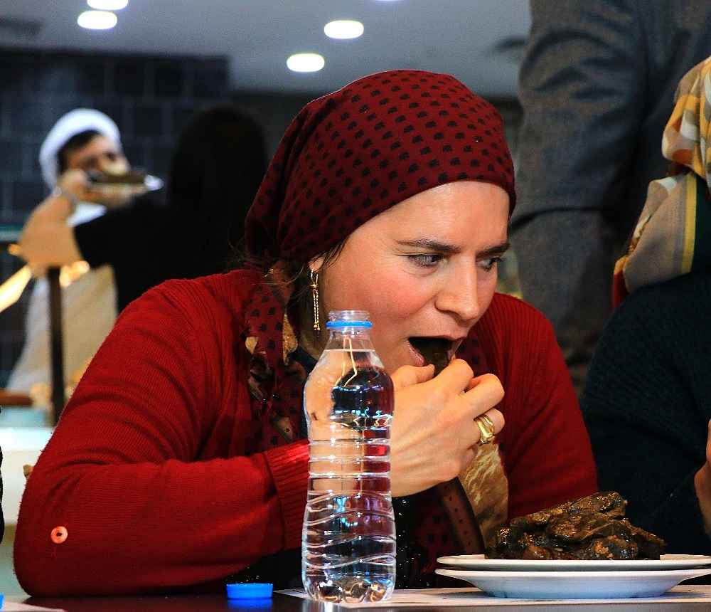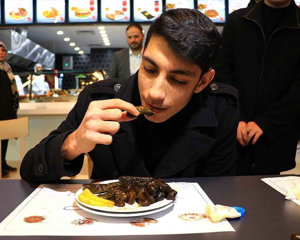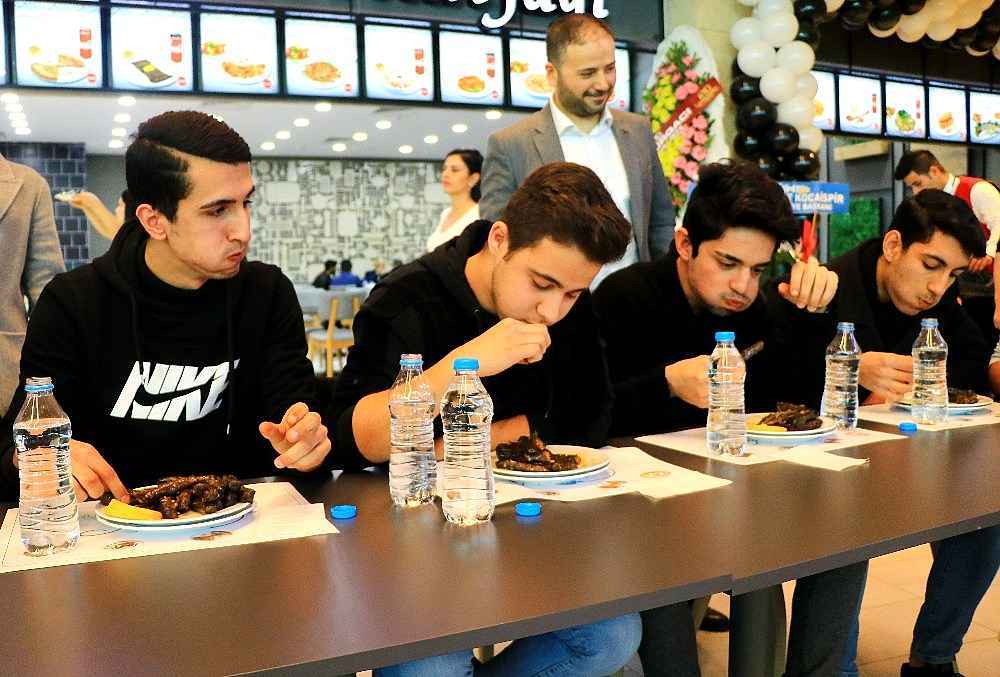 Renkli görüntülere sahne olan yarışmada 19 yaşındaki Mehmet Bilgin, 1 dakikada 20 yaprak sarmasını yiyerek birinci olup yarım altın kazandı.