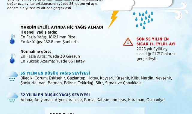 TÜRKİYE genelinde 2025 su yılı (yağışlı periyot) yağışları, son 52 yılın en düşük seviyesine indi. Ülke genelinde bu dönemde 422,5 milimetre yağış kaydedildi. Bu değer, uzun yıllar ortalamasının yüzde 26, geçen yıl aynı döneminin yüzde 29 altında gerçekleşti. Çevre, Şehircilik ve İklim Değişikliği Bakanlığı'na bağlı Meteoroloji Genel Müdürlüğü, 1 Ekim 2024-30 Eylül 2025 dönemi 12 aylık verilerinden oluşan 2025 su yılı raporunu açıkladı. Buna göre; 2025 yağışları, uzun yıllar ortalaması ve geçen yılın aynı döneminin yağışlarının altında gerçekleşti. Ülke genelinde bu dönemde 422,5 milimetre yağış kaydedildi. Bu değer, uzun yıllar ortalamasının (573,4 milimetre) yüzde 26, geçen yıl aynı döneminin (597 milimetre) yüzde 29 altında gerçekleşti. Türkiye geneli 12 aylık su yılı yağışlarının, son 52 yılın en düşük seviyesine indiği tespit edildi. Güneydoğu Anadolu ve İç Anadolu Bölgelerinde son 65, Marmara Bölgesi'nde son 63, Akdeniz Bölgesi'nde son 51 ve Ege Bölgesi'nde son 18 yılın en düşük su yılı yağış seviyeleri gerçekleşti.GÜNEYDOĞU ANADOLU'DA YAĞIŞ YÜZDE 60 AZALDI 2025 su yılı verilerine göre, yağışlar normaline ve 2024 su yılı yağışına göre Marmara'da yüzde 34 azaldı. Ege Bölgesi'nde normaline göre yüzde 28, 2024 su yılı yağışına göre yüzde 14 azalma gerçekleşti. Akdeniz Bölgesi'nde normaline göre yüzde 31, 2024 su yılı yağışına göre yüzde 26 azalma oldu. İç Anadolu Bölgesi'nde normaline göre yüzde 35, 2024 su yılı yağışına göre yüzde 34 azalma kaydedildi. Karadeniz Bölgesi'nde normaline göre yüzde 4, 2024 su yılı yağışına göre yüzde 7 azalma gerçekleşti. Doğu Anadolu Bölgesi'nde normaline göre yüzde 25, 2024 su yılı yağışına göre yüzde 42 azalma tespit edildi. Güneydoğu Anadolu Bölgesi'nde normaline göre yüzde 53, 2024 su yılı yağışına göre yüzde 60 azalma gerçekleşti.GİRESUN'DA YILLIK YAĞIŞ YÜZDE 30 ARTTIİl geneli yağışlarda en fazla yağış 1812,1 milimetre ile Rize'de, normaline göre en fazla artış yüzde 30 ile Giresun'da gerçekleşti. En az yağış 182,8 milimetre ile Şanlıurfa'da, normaline göre en fazla azalma yüzde 66 ile Hatay'da oldu. 2025 su yılı yağışları Bilecik, Çorum, Eskişehir, Gaziantep, Hatay, Kayseri, Kırşehir, Kilis, Mardin, Nevşehir, Şanlıurfa, Van, Batman, Edirne, Tekirdağ, Siirt, Şırnak ve Çanakkale'de 65, Kırıkkale'de 64, Adana, Adıyaman, Afyonkarahisar, Bursa, Kahramanmaraş, Karaman, Osmaniye'de 52, Aksaray, Konya, Niğde'de 51, Hakk'ri 50, Yalova'da son 40 yılın en düşük seviyesinde.MARDİN'E EYLÜLDE HİÇ YAĞMUR YAĞMADI2025 yılı Eylül ayı bazındaki yağış değerlendirmelerine göre ise Türkiye geneli eylül ayı yağışı, normali ve geçen yıl eylül ayı yağışının altında gerçekleşti. Türkiye genelinde eylül ayında ortalama 21,4 milimetre yağış kaydedildi. Bu değer, uzun yıllar ortalamasının (24,9 milimetre) yüzde 14, geçen yıl eylül ayı yağışının (33,8 milimetre) yüzde 37 altında gerçekleşti. Mardin eylül ayında hiç yağış almadı. Mardin'de 65, Edirne, Kırklareli ve Tekirdağ'da son 21 yılın en düşük eylül ayı yağışları kaydedildi.SON 55 YILIN EN SICAK 11'İNCİ EYLÜL AYI2025 yılı Eylül ayı sıcaklık değerlendirmelerine göre, sıcaklık Akdeniz Bölgesi'nin geneli, Edirne, Kadıköy, Kocaeli, Gökçeada, Çanakkale, Bursa, Yalova, Ayvalık, Dikili, Manisa, Uşak, İzmir, Çeşme, Kuşadası, Aydın, Denizli, Bodrum, Muğla, Marmaris, Uzunköprü, İpsala, Burhaniye, Bergama, Gediz, Seferihisar, Ödemiş, Nazilli ve Yatağan çevrelerinde mevsim normallerinin üzerinde gerçekleşti.2025 yılı Eylül ayı sıcaklığı 21,7 derece olarak gerçekleşti. 2025 yılı Eylül ayı, 1991-2020 normalleri eylül ayı ortalamasının 0,8 derece üzerinde gerçekleşti. Eylül 2025, son 55 yılın en sıcak 11'inci eylül ayı olarak kayıtlara geçti. Eylül ayında en düşük sıcaklık eksi 2,4 derece ile Erzurum'da, en yüksek sıcaklık ise 44,6 derece ile Cizre'de ölçüldü. MARMARA'DA ORTA VE ÜZERİ ŞİDDETTE METEOROLOJİK KURAKLIK YAŞANDI2025 Temmuz, Ağustos ve Eylül aylarını içeren 3 aylık kuraklık değerlendirme raporuna göre, Marmara Bölgesi'nin tamamında, Ege Bölgesi'nde Kütahya, Muğla, Afyonkarahisar (Dinar) ve çevrelerinde, Akdeniz Bölgesi'nde Kilis, Hatay, Adana, Antalya, Mersin, Isparta (Eğirdir ve Uluborlu) ve çevrelerinde, İç Anadolu Bölgesi'nde Aksaray, Çankırı, Sivas, Kayseri, Eskişehir, Konya (Kulu, Çumra ve Beyşehir), Niğde (Ulukışla), Kırşehir (Kaman ve Çiçekdağı) ve çevrelerinde, Karadeniz Bölgesi'nde Bartın, Zonguldak Sinop, Düzce, Kastamonu, Rize, Çorum (Osmancık), Trabzon (Akçaabat) ve çevrelerinde, Doğu Anadolu Bölgesi'nde Kars, Ağrı, Şırnak, Hakkari, Malatya, Bingöl, Muş, Tunceli (Çemişgezek), Elazığ (Ağın), Van (Erciş, Gevaş ve Başkale) ve çevrelerinde, Güneydoğu Anadolu Bölgesi'nde Adıyaman, Siirt, Diyarbakır (Ergani) ve çevrelerinde değişen şiddetlerde meteorolojik kuraklık etkili oldu. Marmara Bölgesi genelinde değişen şiddetlerde meteorolojik kuraklık yaşandı.