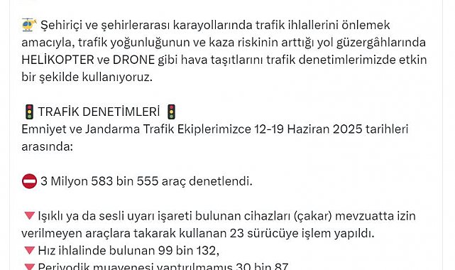 Paylaşımında ayrıca 12-19 Haziran tarihleri arasında yapılan trafik denetimi verilerine yer veren Bakan Yerlikaya, "Emniyet ve jandarma trafik ekiplerimizce 12-19 Haziran 2025 tarihleri arasında 3 milyon 583 bin 555 araç denetlendi. Işıklı ya da sesli uyarı işareti bulunan cihazları (çakar) mevzuatta izin verilmeyen araçlara takarak kullanan 23 sürücüye işlem yapıldı. Hız ihlalinde bulunan 99 bin 132, periyodik muayenesi yaptırılmamış 30 bin 87, emniyet kemeri kullanmayan 25 bin 270, sürücü belgesiz araç kullanan 16 bin 499 ve zorunlu mali sorumluluk sigortası bulunmayan 7 bin 961 olmak üzere diğer işlemlerle birlikte; toplam 468 bin 539 araca/sürücüye işlem yapıldı. Trafikte güvenliği sağlamak için hem polis ve jandarma ekiplerimizle hem de havadan helikopter ve dron sistemlerimizle denetimlerimize aralıksız devam ediyoruz. Yolculuklar sizleri sevdiklerinize kavuşturmak için vardır, ayırmak için değil" açıklamasında bulundu.