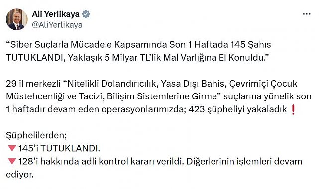 İÇİŞLERİ Bakanı Ali Yerlikaya, son 1 haftada siber suçlarla mücadele kapsamında 52 ildeki operasyonlarda gözaltına alınan 423 kişiden 145'inin tutuklandığını, yaklaşık 5 milyar TL'lik mal varlığına el konulduğunu duyurdu.Bakan Ali Yerlikaya, sosyal medya hesabından yaptığı açıklamada, "29 il merkezli 'Nitelikli dolandırıcılık, yasa dışı bahis, çevrim içi çocuk müstehcenliği ve tacizi, bilişim sistemlerine girme' suçlarına yönelik son 1 haftadır devam eden operasyonlarımızda; 423 şüpheliyi yakaladık. Şüphelilerden 145'i tutuklandı. 128'i hakkında adli kontrol kararı verildi. Diğerlerinin işlemleri devam ediyor" ifadelerini kullandı.Bakan Yerlikaya, operasyonlar sonucu; ruhsatsız tabancalar ile çok sayıda dijital materyal ele geçirildiğini ve yaklaşık 5 milyar TL'lik mal varlığına el konulduğunu ifade ederek, "Şüphelilerin; sosyal medya platformları ve oltalama (Phishing) siteleri üzerinden 'forex yatırım ortaklığı, kripto yatırım danışmanlığı, hediye çeki, araç kiralama/kapora, kiralık bungalov, ürün satışı ve dijital sazan sarmalı' adı altında vatandaşlarımızı dolandırdıkları, yasa dışı bahis ve kumarda kullanılmak üzere banka hesapları topladıkları, yasa dışı bahis sitelerine alt yapı sağlama, kumar oynatma ve para nakline aracılık ettikleri, müstehcen çocuk görüntüleri bulundurdukları, vatandaşlarımızın mobil bankacılık hesaplarına erişerek haksız kazanç sağladıkları tespit edildi" dedi.Ayrıca operasyona katılan ekipleri tebrik eden Bakan Yerlikaya, "Kara Vatan'da olduğu gibi Siber Vatan'da da sanal devriyelerimizle suç ve suçlularla mücadelemize kararlılıkla devam ediyoruz" dedi.