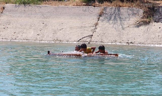 ADANA'da kavurucu sıcaklıklar etkisini sürdürürken, her yaz onlarca kişinin ölümüne neden olan kanallara giren bazı çocuklar akıntıya kapılmamak için eski bir koltuğu kayık gibi kullanarak tehlikeli sulara atladı.Kentte hafta sonu 35 derece ölçülen hava sıcaklığı güneş altındaki termometrelerde 38 derece olarak görüldü. Yüksek nemin etkisiyle özellikle öğle saatlerinde hissedilen sıcaklığın 40 dereceleri aştığı kentte bazı gençler ve çocuklar, her yaz onlarca kişinin ölümüne neden olan ve yetkililerin sık sık uyarılarda bulunup, girilmemesi yönünde afişler astığı sulama kanallarında serinledi. 'BİR ANLIK EĞLENCE, BİR ÖMÜR PİŞMANLIK OLABİLİR'Daha önce gençler akıntıya kapılmamak için kanalların üzerinden geçen yaya geçidi ya da korkuluklara asılan ipleri kendilerine bağlayarak sürüklenmemek için çaba harcarken, bu kez kanalda 3 çocuğun attıkları koltukla yüzdüğü anlar kameralara yansıdı. Polislerin 'Bir anlık eğlence, bir ömür pişmanlık olabilir' yazılı afiş astığı merkez Yüreğir ilçesindeki Yavuzlar Mahallesi İlim Yolu üzerinde bulunan sulama kanalında yaşları 15'ten küçük 3 çocuk, önce buldukları eski bir koltuğu suya attı. Ardından kendileri de suya atlayan çocuklar koltuğu kayık gibi kullanarak saatlerce tehlikeli sularda yüzdü. Çocukların sözde eğlencesi, görenlerin tepkisini çekti.