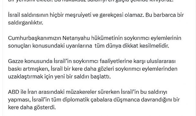 AK Parti Genel Başkan Yardımcısı ve Parti Sözcüsü Ömer Çelik, İsrail'in İran'a saldırısını en güçlü şekilde kınadıklarını açıkladı.AK Parti'li Ömer Çelik, sosyal medya hesabından yaptığı açıklamada, "İsrail İran'a saldırarak tüm bölgeyi ateşe atan vahşi ve barbar saldırılarına bir yenisini ekledi. Bu hukuksuz saldırıyı en güçlü şekilde kınıyoruz. İsrail saldırısının hiçbir meşruiyeti ve gerekçesi olamaz. Bu barbarca bir saldırganlıktır. Cumhurbaşkanımızın, Netanyahu hükümetinin soykırımcı eylemlerinin sonuçları konusundaki uyarılarına tüm dünya dikkat kesilmelidir. Gazze konusunda İsrail'in soykırımcı faaliyetlerine karşı uluslararası baskı artmışken, İsrail bir kere daha gözleri soykırımcı eylemlerinden uzaklaştırmak için yeni bir saldırı başlattı. ABD ile İran arasındaki müzakereler sürerken İsrail'in bu saldırıyı yapması, İsrail'in tüm diplomatik çabalara düşmanca davrandığını bir kere daha gösterdi. İsrail saldırganlığı tüm dünya için tehdittir. Buna karşı tüm dünya ortak somut tedbirler almalıdır" ifadelerini kullandı.