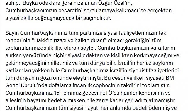 AK Parti Sözcüsü Ömer Çelik, "CHP Genel Başkanı Özgür Özel'in Sayın Cumhurbaşkanımızın Filistin hassasiyetini sorgulamaya kalkması, Filistin davasını destekleyen tek bir kişinin bile ciddiye almayacağı bir şeydir" dedi.AK Parti'li Ömer Çelik, sosyal medya hesabından yaptığı açıklamada, CHP Genel Başkanı Özgür Özel'in Türkiye'yi yurt dışı odaklara şikayet eden bir siyasi profile sahip olduğunu belirterek, "Başka odaklara göre hizalanan Özgür Özel'in, Cumhurbaşkanımızın cesaretini sorgulamaya kalkması ise gerçekten siyasi akılla bağdaşmayacak bir saçmalıktır. Sayın Cumhurbaşkanımız tüm partimize siyasi faaliyetlerimizin tek rehberinin 'Hakk'ın rızası ve halkın duası' olması gerektiğini tüm toplantılarımızda ilk ilke olarak söyler. Cumhurbaşkanımızın kararlarını alırken yeryüzünde hiçbir siyasi odaktan ve kişilikten korkmayacağını ve çekinmeyeceğini milletimiz ve tüm dünya bilir. İsrail'in henüz soykırım katliamları yokken bile Cumhurbaşkanımız İsrail'in Siyonist faaliyetlerini tüm dünyanın gözü önünde eleştirmiştir. Bu cesur ve ilkeli siyaseti BM Genel Kurulu'nda defalarca insanlık cephesinin takdirini toplamıştır. Cumhurbaşkanımız 15 Temmuz gecesi FETÖ'cü hainler, kendisinin ve ailesinin hayatını hedef almışken bile zerre kadar geri adım atmamıştır. Cumhurbaşkanımızın tüm siyasi hayatı her anlamda bedeli ödenmiş ve cesaretle donanmış bir hayattır. O yüzden tüm dünyada Sayın Cumhurbaşkanımız ve siyasi irade sahibi olmak yan yana zikredilir. Cumhurbaşkanımızın siyasi iradesine dil uzatanların sadece kendi siyasetlerinin acizliğini ve teslimiyetçiliğini ortaya koyduğunu defalarca gördük" ifadelerini kullandı.'GÜDÜMLÜ MERCEKLERDEN BAKARAK KONUŞMASI TRAJEDİDİR'Çelik, Özgür Özel'in Hamas'ı 'terör örgütü' diye yaftalamaya çalıştığını, arkasından tepkiler gelince 'Terör örgütü demedim, terör eylemleri yapıyor dedim' dediğini ifade ederek, "Hamas konusundaki bu dil, sadece İsrail'in saldırgan siyasetini destekleyenler tarafından kullanılan bir dildir. Özgür Özel'in içine düştüğü vahim durumu tashih etmesi ve Filistin davasından özür dilemesi gerekirken, Filistin konusuna güdümlü merceklerden bakarak konuşması başlı başına bir trajedidir. Cumhurbaşkanımız ise siyasi yasaklı olduğu dönemde bile ABD'de kendisine Hamas hakkında sorulan bir soruya cevaben 'Onlara terörist denmesi asla doğru değildir. Onlar vatanlarını İsrail işgaline karşı savunan vatanseverlerdir' demiştir" dedi.'CHP'Yİ DÜZGÜN BİR ÇİZGİYE ÇEKMELİ'Çelik, Özgür Özel'in rahmetli Bülent Ecevit'in Filistin duruşuna atıf yaparak bugünkü CHP politikasını meşrulaştırmaya çalışmasının ise hiçbir zemini olmadığını belirterek, "Rahmetli Ecevit'in DSP'yi kurarak CHP ile arasına çektiği çizgi açıktır. Türkiye Cumhuriyeti'nin meşru mavi vatan tezine karşı çıkan ve Yunanistan'ın tezine destek verenler, Özgür Özel'in ekibindedir. Milli güvenliğimiz için Suriye'ye yaptığımız meşru askeri harekatları eleştirenler CHP yönetimindedir. Libya'da meşru ve Türkiye dostu hükümete karşı ülkemize silah çekmiş odakları savunanlar CHP'li siyasetçilerdir. Türkiye'nin can Azerbaycan'ın Karabağ konusundaki mücadelesine verdiği desteğe yalan siyasetiyle iftira atan açıklama CHP içinden gelmiştir. Özgür Özel'in Cumhurbaşkanımıza, AK Parti'mize ve Cumhur İttifakımıza her saldırısı esasında CHP'nin her yerini sarmış siyasetsizliği ve skandalları örtme gayretidir. Özgür Özel sürekli vahim hatalar yaptığı konularda konuşmak yerine CHP'yi düzgün bir çizgiye çekmeye enerji harcamalıdır. Özgür Özel, Cumhurbaşkanımızı eleştirmeye kalktığı her durumda vahim ve tarihi hatalar yapmaya devam ediyor. O nedenle Cumhurbaşkanımızın siyasi hayatından dersler alacağı bir siyasi çizgiye dönmesi, doğru yolu bulması açısından gereklidir" ifadelerini kullandı.