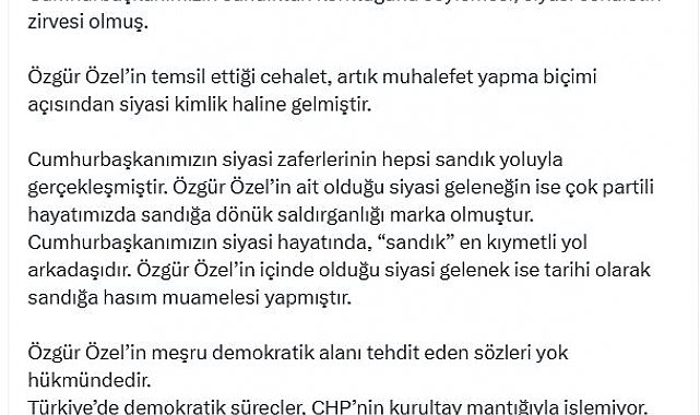 AK Parti Genel Başkan Yardımcısı ve Parti Sözcüsü Ömer Çelik, "CHP Genel Başkanı Özgür Özel'in saygısız bir üslupla Cumhurbaşkanımızın sandıktan korktuğunu söylemesi, siyasi cehaletin zirvesi olmuş" dedi.AK Parti'li Ömer Çelik, sosyal medya hesabından yaptığı açıklamada, "CHP Genel Başkanı Özgür Özel'in saygısız bir üslupla Cumhurbaşkanımızın sandıktan korktuğunu söylemesi, siyasi cehaletin zirvesi olmuş. Özgür Özel'in temsil ettiği cehalet, artık muhalefet yapma biçimi açısından siyasi kimlik haline gelmiştir. Cumhurbaşkanımızın siyasi zaferlerinin hepsi sandık yoluyla gerçekleşmiştir. Özgür Özel'in ait olduğu siyasi geleneğin ise çok partili hayatımızda sandığa dönük saldırganlığı marka olmuştur. Cumhurbaşkanımızın siyasi hayatında, sandık en kıymetli yol arkadaşıdır. Özgür Özel'in içinde olduğu siyasi gelenek ise tarihi olarak sandığa hasım muamelesi yapmıştır. Özgür Özel'in meşru demokratik alanı tehdit eden sözleri yok hükmündedir. Türkiye'de demokratik süreçler, CHP'nin kurultay mantığıyla işlemiyor. Özgür Özel'in CHP'nin kurultay mantığıyla, demokrasinin aynı şey olmadığını anlaması kendine yapacağı en büyük iyiliktir" ifadelerini kullandı.
