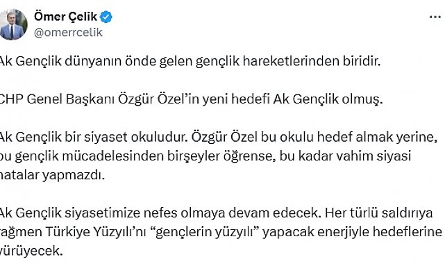 AK Parti Sözcüsü Ömer Çelik, "CHP Genel Başkanı Özgür Özel'in yeni hedefi Ak Gençlik olmuş. Ak Gençlik bir siyaset okuludur. Özgür Özel bu okulu hedef almak yerine, bu gençlik mücadelesinden bir şeyler öğrense, bu kadar vahim siyasi hatalar yapmazdı" dedi.Sözcü Çelik, sosyal medya hesabı üzerinden yaptığı açıklamada, "Ak Gençlik dünyanın önde gelen gençlik hareketlerinden biridir. CHP Genel Başkanı Özgür Özel'in yeni hedefi Ak Gençlik olmuş. Ak Gençlik bir siyaset okuludur. Özgür Özel bu okulu hedef almak yerine, bu gençlik mücadelesinden bir şeyler öğrense, bu kadar vahim siyasi hatalar yapmazdı. Ak Gençlik siyasetimize nefes olmaya devam edecek. Her türlü saldırıya rağmen Türkiye Yüzyılı'nı 'gençlerin yüzyılı' yapacak enerjiyle hedeflerine yürüyecek" ifadelerini kullandı.