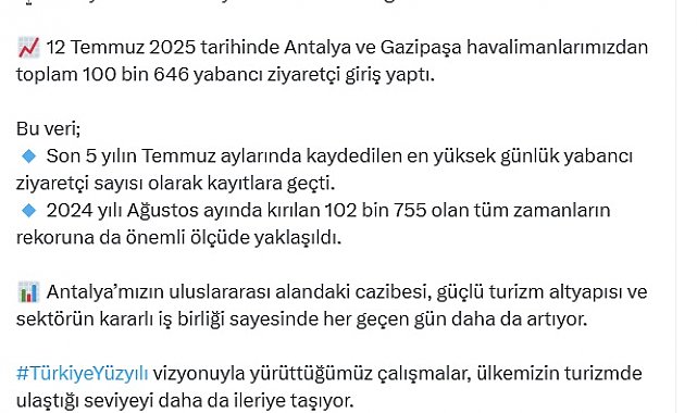 KÜLTÜR ve Turizm Bakanı Mehmet Nuri Ersoy, 12 Temmuz 2025'te Antalya'ya gelen yabancı turist sayısının 100 bini geçtiğini duyurdu.Bakan Ersoy, sosyal medya hesabından Antalya'ya gelen turist sayılarıyla ilgili açıklama yaptı. Ersoy, "Antalya'da turizmde yeni bir zirve daha geride bırakıldı. 12 Temmuz 2025 tarihinde Antalya ve Gazipaşa havalimanlarımızdan toplam 100 bin 646 yabancı ziyaretçi giriş yaptı. Bu veri; son 5 yılın temmuz aylarında kaydedilen en yüksek günlük yabancı ziyaretçi sayısı olarak kayıtlara geçti. 2024 yılı Ağustos ayında kırılan 102 bin 755 olan tüm zamanların rekoruna da önemli ölçüde yaklaşıldı. Antalya'mızın uluslararası alandaki cazibesi, güçlü turizm altyapısı ve sektörün kararlı iş birliği sayesinde her geçen gün daha da artıyor. Türkiye Yüzyılı vizyonuyla yürüttüğümüz çalışmalar, ülkemizin turizmde ulaştığı seviyeyi daha da ileriye taşıyor. Başta sektör paydaşlarımız olmak üzere emeği geçen herkese teşekkür ediyorum" dedi.Bakanlıktan yapılan yazılı açıklamada ise, "12 Temmuz 2025 günü Antalya Havalimanı üzerinden 98 bin 777, Gazipaşa Havalimanı'ndan ise 1869 yabancı ziyaretçi Türkiye'ye giriş yaptı. Böylece toplam sayı 100 bin 646'ya ulaştı. Antalya, sahip olduğu doğal güzellikleri, tarihi mirası, sürdürülebilir turizm politikaları ve kaliteli hizmet anlayışıyla Türkiye'nin en çok tercih edilen turizm destinasyonlarından biri olma konumunu güçlendirmeye devam ediyor" denildi.
