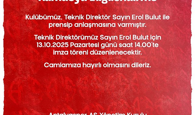 - SÜPER Lig ekibi Hesap.com Antalyaspor, teknik direktör Erol Bulut ile prensip anlaşmasına varıldığını duyurdu. Kırmızı-beyazlıların resmi sitesinden yapılan açıklamada, "Kulübümüz, Teknik Direktör Sayın Erol Bulut ile prensip anlaşmasına varmıştır. Teknik direktörümüz Sayın Erol Bulut için 13.10.2025 Pazartesi günü saat 14.00'te imza töreni düzenlenecektir. Camiamıza hayırlı olmasını dileriz" ifadelerine yer verdi.