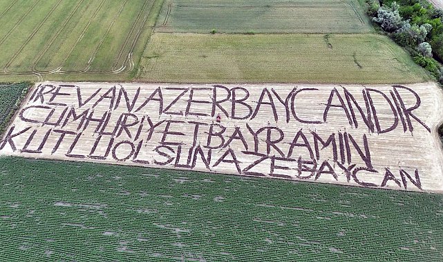 KIRKLARELİ'nin Lüleburgaz ilçesinde fotoğraf sanatçısı Burak Tunçkol, Azerbaycan'ın Bağımsızlık Günü'nü traktör ve pullukla tarlasına yazdığı 'İrevan Azerbaycan'dır. Cumhuriyet Bayramın Kutlu Olsun Azerbaycan' yazısıyla kutladı. Tunçkol, "Ben bu yazıyı hem kendim hem de 82 milyon Türkiye Cumhuriyeti'nin hissiyatını tarlaya yansıtmak için yazdım" dedi.Evrensekiz beldesinde yaşayan Burak Tunçkol, Azerbaycan'ın 28 Mayıs Bağımsızlık Günü dolayısıyla, traktör ve pullukla tarlasına 'İrevan Azerbaycan'dır. Cumhuriyet Bayramın kutlu olsun Azerbaycan' yazdı. Yaklaşık 5 saatte yazıyı tarlaya işleyen Tunçkol, "Bildiğiniz gibi 28 Mayıs'ta kardeş ülkemiz Azerbaycan'ın Cumhuriyet Bayramı var. Ben de bugün burada tarlaya, traktörle ve pullukla 'İrevan Azerbaycan'dır. Cumhuriyet Bayramın kutlu olsun Azerbaycan' yazısını yazdım. Ben bu yazıyı hem kendim için hem de 82 milyon Türkiye Cumhuriyeti'nin hissiyatını tarlaya yansıtmak için yazdım" dedi.Azerbaycan'ın Kurtuluş Savaşı'nda Türkiye'ye yardımlarda bulunduğunu söyleyen Tunçkol, "Bize Kurtuluş Savaşı'nda destek olan Azerbaycan, ormanlarımız yandığı zaman ilk yardıma gelen Azerbaycan ve 6 Şubat depreminde ilk yardıma gelen Azerbaycan'dır. Bizim dünyadaki tek kardeş ülkemiz can Azerbaycan'dır. İrevan, bildiğiniz gibi yıllar önce Azerbaycan toprağıyken Ermenistan'a verilmiş. Bu, Türkiye'de bizim de içimizde kanayan bir yaradır. İnşallah gün gelecek İrevan Azerbaycan toprağı olacak ve aradan haritalar kalkacak ve biz Azerbaycan'la tek harita olacağız. Cenabıallah bize göstermezse bile neslimize o günleri göstereceğine inanıyorum" diye konuştu.