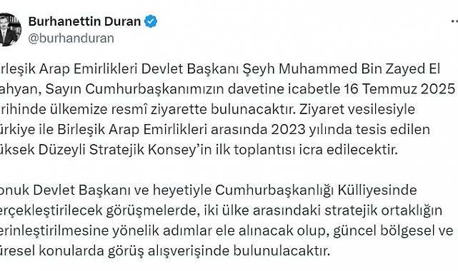İLETİŞİM Başkanı Burhanettin Duran, Birleşik Arap Emirlikleri (BAE) Devlet Başkanı Şeyh Muhammed Bin Zayed El Nahyan'ın yarın Türkiye'ye resmi ziyarette bulunacağını duyurdu.İletişim Başkanı Duran, sosyal medya hesabından yaptığı açıklamada, "Birleşik Arap Emirlikleri Devlet Başkanı Şeyh Muhammed Bin Zayed El Nahyan, Sayın Cumhurbaşkanımızın davetine icabetle 16 Temmuz 2025 tarihinde ülkemize resmi ziyarette bulunacaktır. Ziyaret vesilesiyle Türkiye ile Birleşik Arap Emirlikleri arasında 2023 yılında tesis edilen Yüksek Düzeyli Stratejik Konsey'in ilk toplantısı icra edilecektir. Konuk Devlet Başkanı ve heyetiyle Cumhurbaşkanlığı Külliyesinde gerçekleştirilecek görüşmelerde, iki ülke arasındaki stratejik ortaklığın derinleştirilmesine yönelik adımlar ele alınacak olup, güncel bölgesel ve küresel konularda görüş alışverişinde bulunulacaktır" dedi.