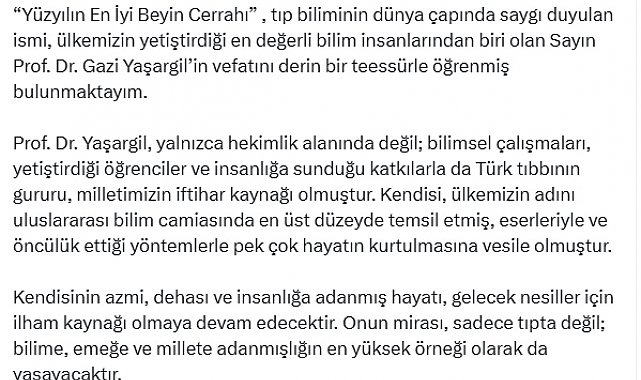 MHP Genel Başkanı Devlet Bahçeli, 'Yüzyılın en iyi beyin cerrahı' olarak anılan ve bugün hayatını kaybeden Prof. Dr. Gazi Yaşargil için taziye mesajı yayımladı.Bahçeli, sosyal medya hesabından yayımladığı mesajda, "Yüzyılın En İyi Beyin Cerrahı', tıp biliminin dünya çapında saygı duyulan ismi, ülkemizin yetiştirdiği en değerli bilim insanlarından biri olan Sayın Prof. Dr. Gazi Yaşargil'in vefatını derin bir teessürle öğrenmiş bulunmaktayım. Prof. Dr. Yaşargil, yalnızca hekimlik alanında değil; bilimsel çalışmaları, yetiştirdiği öğrenciler ve insanlığa sunduğu katkılarla da Türk tıbbının gururu, milletimizin iftihar kaynağı olmuştur. Kendisi, ülkemizin adını uluslararası bilim camiasında en üst düzeyde temsil etmiş, eserleriyle ve öncülük ettiği yöntemlerle pek çok hayatın kurtulmasına vesile olmuştur. Kendisinin azmi, dehası ve insanlığa adanmış hayatı, gelecek nesiller için ilham kaynağı olmaya devam edecektir. Onun mirası, sadece tıpta değil; bilime, emeğe ve millete adanmışlığın en yüksek örneği olarak da yaşayacaktır. Milletimizin başı sağ olsun. Ruhu şad, mekanı cennet olsun" dedi.