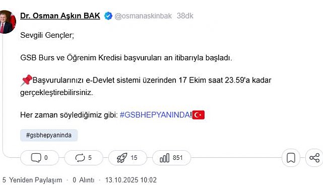GENÇLİK ve Spor Bakanı Osman Aşkın Bak, 2025-2026 eğitim öğretim dönemi için burs/kredi başvurularının başladığını açıkladı. 17 Ekim Cuma günü saat 23.59'a kadar devam edecek olan burs/kredi başvuruları e-Devlet üzerinden alınacak.Gençlik ve Spor Bakanı Osman Aşkın Bak, NSosyal hesabından yaptığı duyuruyla, 2025-2026 eğitim öğretim dönemi için burs/kredi başvurularının başladığını bildirdi. Bakan Bak, "Sevgili Gençler; Gençlik ve Spor Bakanlığı burs ve öğrenim kredisi başvuruları an itibarıyla başladı. Başvurularınızı e-Devlet sistemi üzerinden 17 Ekim saat 23.59'a kadar gerçekleştirebilirsiniz. Her zaman söylediğimiz gibi; GSB hep yanında" ifadelerini kullandı.Bakanlıktan alınan bilgilere göre; 2025-2026 eğitim öğretim yılında ilk defa bir yükseköğretim programına girmeye hak kazanan öğrenciler, halen bir yükseköğretim programına devam eden ara sınıf öğrencileri ve yurt dışında öğrenim gören Türk vatandaşları burs/kredi başvurusunda bulunabilecek. 17 Ekim Cuma günü saat 23.59'a kadar devam edecek olan burs/kredi başvuruları e-Devlet üzerinden alınacak. Başvuru bilgilerini değiştirmek isteyen öğrenciler, yine bu tarihe kadar e-Devlet üzerinden bilgilerini güncelleyebilecek. İlk defa bir yükseköğretim programına girmeye hak kazanan öğrenciler ile halen bir yükseköğretim programına devam eden ara sınıf öğrencileri ve yurt dışında öğrenim gören Türk vatandaşları burs/kredi başvurusunda bulunabilecek.BAŞVURUDA DİKKAT EDİLMESİ GEREKENLERBurs/kredi başvuruları e-Devlet'te yer alan öğrenim bilgilerine göre alınacağı için öğrencilerin e-Devlet'teki okul/bölüm bilgilerini kontrol etmeleri; bilgilerinde hata olan öğrencilerin, üniversitenin öğrenci işleriyle görüşerek bilgilerinin düzeltilmesini istemeleri gerekiyor. Başvuru sırasında öğrencilerin beyan ettiği ekonomik, sosyal ve başarı durumuna ilişkin bilgiler, Gençlik ve Spor Bakanlığı tarafından kamu kurumları aracılığıyla teyit edilecek. Yapılan değerlendirme sonucunda mevzuata uygun olan öğrencilere burs ya da öğrenim kredisi tahsis edilecek. Başvuru sırasında yanlış beyanda bulunan öğrencilerin başvuruları geçersiz sayılacak.ÖZEL DURUMLU ÖĞRENCİLERBaşvuruda özel durum beyan eden öğrencilerin belge göndermesi gerekmiyor. Başvuru ekranında özel durumu; şehit/gazi çocukları (şehit bekar ise bekar kardeşi/gazi bekar ise kendisi), anne ve babası (her ikisi de) vefat edenler, tam teşekküllü devlet hastanesinden alınan sağlık kurulu raporu ile yüzde 40 ve üzerinde engelli olanlar, lise ve dengi öğrenimlerini Aile ve Sosyal Hizmetler Bakanlığına bağlı sevgi evlerinde tamamlayanlar, Darüşşafaka Lisesi'nden mezun olanlar ve milli sporcuları içeriyor. Özel durum beyan eden öğrencilerin bilgileri Gençlik ve Spor Bakanlığı tarafından kontrol edilecek. Başvuru sürecinde sorun yaşayan öğrenciler 7/24 hizmet veren ALO GSB (444 0 472) ile 'KYK_DESTEK' ve 'GSB_DESTEK' adlı sosyal medya hesapları üzerinden yardım talep edebilecek.