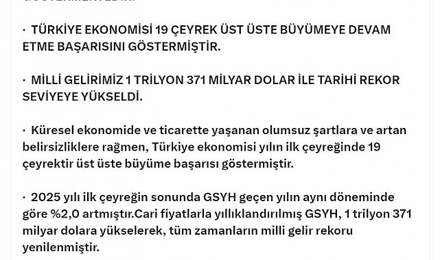 Bakan Ömer Bolat, birinci çeyrek büyüme verilerine ilişkin sosyal medya hesabından açıklama yaptı. Bakan Bolat, "Küresel ekonomide ve ticarette yaşanan olumsuz şartlara ve artan belirsizliklere rağmen, Türkiye ekonomisi yılın ilk çeyreğinde 19 çeyrektir üst üste büyüme başarısı göstermiştir. 2025 yılı ilk çeyreğin sonunda GSYH geçen yılın aynı döneminde göre yüzde 2 artmıştır. Cari fiyatlarla yıllıklandırılmış GSYH, 1 trilyon 371 milyar dolara yükselerek, tüm zamanların milli gelir rekoru yenilenmiştir. Yatırımların ekonomik büyümeye katkısı 0,5 puan gerçekleşirken, uyguladığımız ekonomi programının etkisiyle, cari işlemler açığının GSYH'ye oranı yıllıklandırılmış bazda ilk çeyrekte yüzde 0,9 olarak gerçekleşmiştir. Üretim ve ihracat artışı, istihdama da olumlu katkılar yapmaktadır. 2025 yılı ilk çeyreğinde işsizlik oranı yüzde 8,2'ye gerilemiştir. İşsiz sayısı geçen yılın aynı çeyreğine kıyasla 245 bin kişi azalarak 2 milyon 884 bin kişiye gerilemiştir" dedi.