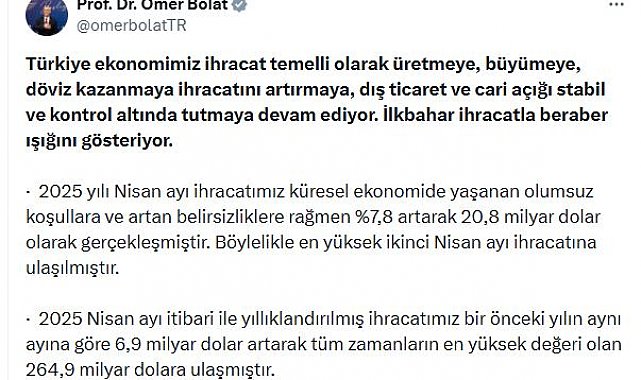 TİCARET Bakanı Ömer Bolat, "AB-27'nin yıllıklandırılmış ithalatının hala yatay seyrini koruması, tarife artışlarının getirdiği belirsizlik ve Çin'in ihracat fiyatlarını düşürmeye devam etmesiyle beraber gelen zorlu rekabet koşullarına rağmen ihracatımızda artış devam etmektedir" dedi.Ticaret Bakanı Ömer Bolat, dış ticaret istatistiklerine ilişkin sosyal medya hesabından açıklama yaptı. Bakan Bolat, Türkiye ekonomisinin ihracat temelli olarak büyümeye devam ettiğini belirterek, "İlkbahar, ihracatla beraber ışığını gösteriyor. 2025 yılı Nisan ayı ihracatımız, küresel ekonomide yaşanan olumsuz koşullara ve artan belirsizliklere rağmen yüzde 7,8 artarak 20,8 milyar dolar olarak gerçekleşmiştir. Böylelikle en yüksek ikinci nisan ayı ihracatına ulaşılmıştır. 2025 Nisan ayı itibarı ile yıllıklandırılmış ihracatımız bir önceki yılın aynı ayına göre 6,9 milyar dolar artarak tüm zamanların en yüksek değeri olan 264,9 milyar dolara ulaşmıştır. AB-27'nin yıllıklandırılmış ithalatının hala yatay seyrini koruması, tarife artışlarının getirdiği belirsizlik ve Çin'in ihracat fiyatlarını düşürmeye devam etmesiyle beraber gelen zorlu rekabet koşullarına rağmen ihracatımızda artış devam etmektedir" dedi.'OCAK-NİSAN DÖNEMİNDE İHRACATIMIZ 86,1 MİLYAR DOLAR OLMUŞTUR'2025 yılı Ocak-Nisan döneminde ihracatın geçen yılın aynı dönemine göre yüzde 3,7 artışla 86,1 milyar dolar olduğunu vurgulayan Bolat, "2025 Nisan ayında ithalat bir önceki yılın aynı ayına göre yüzde 12,7 artarak 32,9 milyar dolar olmuştur. 2025 yılının Ocak-Nisan döneminde ithalatımız geçen yılın aynı dönemine göre yüzde 6,6 artışla 120,7 milyar dolar olmuştur. 2025 Nisan ayında yıllıklandırılmış ithalatımız bir önceki yılın aynı ayına göre 0,6 milyar dolar artarak 351,5 milyar dolar olarak gerçekleşmiştir. Dış ticaret açığımız 2025 Nisan ayında yüzde 22,3 oranında artarak 12,1 milyar dolar olarak gerçekleşmiştir. 2025 yılının Ocak-Nisan döneminde dış ticaret açığımız geçen yılın aynı dönemine göre yüzde 14,7 artışla 34,6 milyar dolar olmuştur. Yıllıklandırılmış dış ticaret açığımız geçen yılın aynı ayına göre 6,3 milyar dolar gerileyerek 86,7 milyar dolar olarak gerçekleşmiştir. Küresel ekonomi ve ticaretteki zorlu koşullara rağmen Bakanlık olarak ihracatçılarımızın önünü açan desteklerimiz ve etkin ticari diplomasi faaliyetlerimiz ile 2025 yılında da azim ve gayretle çalışacağımızı ifade etmek isterim" ifadelerini kullandı.