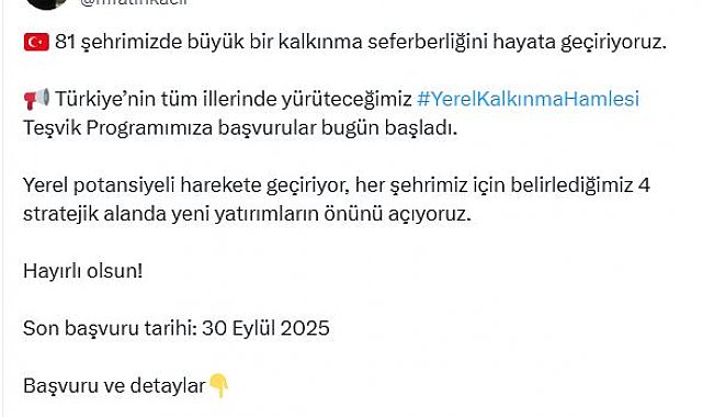 SANAYİ ve Teknoloji Bakanı Mehmet Fatih Kacır, 81 ilde büyük bir kalkınma seferberliğini hayata geçirdiklerini belirterek, "Türkiye'nin tüm illerinde yürüteceğimiz Yerel Kalkınma Hamlesi Teşvik Programımıza başvurular bugün başladı" dedi. Bakan Kacır, sosyal medya hesabından yaptığı açıklamada, "81 şehrimizde büyük bir kalkınma seferberliğini hayata geçiriyoruz. Türkiye'nin tüm illerinde yürüteceğimiz Yerel Kalkınma Hamlesi Teşvik Programımıza başvurular bugün başladı. Yerel potansiyeli harekete geçiriyor, her şehrimiz için belirlediğimiz 4 stratejik alanda yeni yatırımların önünü açıyoruz" dedi. Başvuru ve detaylara; 'https://yerelkalkinmahamlesi.sanayi.gov.tr' internet adresinden ulaşılabilecek. Başvurular, 30 Eylül 2025 tarihine kadar yapılabilecek.