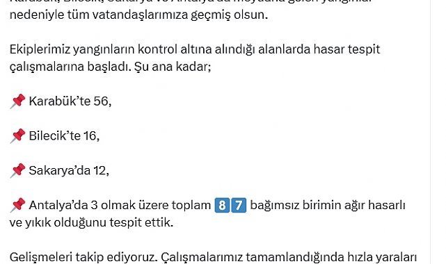 ÇEVRE, Şehircilik ve İklim Değişikliği Bakanı Murat Kurum, Karabük, Bilecik, Sakarya ve Antalya'daki orman yangınlarında 87 bağımsız birimin ağır hasarlı ve yıkık olduğunun tespit edildiğini açıkladı.Çevre, Şehircilik ve İklim Değişikliği Bakanı Murat Kurum sosyal medya hesabından paylaşım yaparak, Karabük, Bilecik, Sakarya ve Antalya'da meydana gelen yangınlar nedeniyle tüm vatandaşlara geçmiş olsun dileklerini iletti. Kurum paylaşımında, ekiplerin yangınların kontrol altına alındığı alanlarda hasar tespit çalışmalarına başladığını belirterek, şu ana kadar, Karabük'te 56, Bilecik'te 16, Sakarya'da 12, Antalya'da 3 olmak üzere toplam 87 bağımsız birimin ağır hasarlı ve yıkık olduğunun tespit edildiğini açıkladı. Kurum paylaşımında, "Gelişmeleri takip ediyoruz. Çalışmalarımız tamamlandığında hızla yaraları saracağız" ifadelerini kullandı.