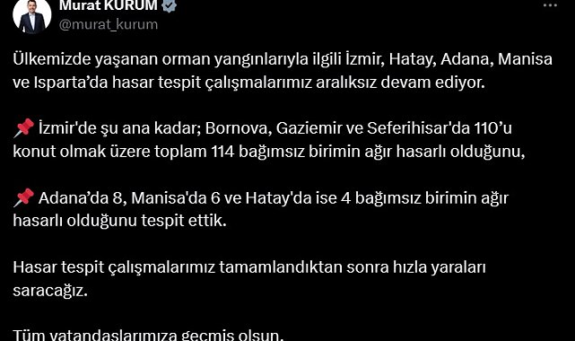 ÇEVRE, Şehircilik ve İklim Değişikliği Bakanı Murat Kurum, 5 ildeki orman yangınlarında 132 bağımsız birimin ağır hasar gördüğünü açıkladı.Çevre, Şehircilik ve İklim Değişikliği Bakanı Murat Kurum, sosyal medya hesabından yaptığı açıklamada, "Ülkemizde yaşanan orman yangınlarıyla ilgili İzmir, Hatay, Adana, Manisa ve Isparta'da hasar tespit çalışmalarımız devam ediyor. İzmir'de şu ana kadar; Bornova, Gaziemir ve Seferihisar'da 110'u konut olmak üzere toplam 114 bağımsız birimin ağır hasarlı olduğunu, Adana'da 8, Manisa'da 6 ve Hatay'da ise 4 bağımsız birimin ağır hasarlı olduğunu tespit ettik. Hasar tespit çalışmalarımız tamamlandıktan sonra hızla yaraları saracağız. Tüm vatandaşlarımıza geçmiş olsun" ifadelerini kullandı.