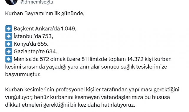SAĞLIK Bakanı Kemal Memişoğlu, Kurban Bayramı'nın ilk gününde; 81 ilde toplam 14 bin 372 kişinin kurban kesimi sırasında yaşadığı yaralanmalar sonucu sağlık tesislerine başvurduğunu açıkladı.Sağlık Bakanı Kemal Memişoğlu sosyal medya hesabından yaptığı paylaşımda, "Kurban Bayramı'nın ilk gününde; Başkent Ankara'da 1049, İstanbul'da 753, Konya'da 655, Gaziantep'te 634, Manisa'da 572 olmak üzere 81 ilimizde toplam 14.372 kişi kurban kesimi sırasında yaşadığı yaralanmalar sonucu sağlık tesislerimize başvurmuştur. Kurban kesimlerinin profesyonel kişiler tarafından yapılması gerektiğini vurguluyor; henüz kurbanını kesmeyen vatandaşlarımıza bu hususa dikkat etmeleri gerektiğini bir kez daha hatırlatıyoruz. Yaralanan vatandaşlarımıza Rabb'imden acil şifalar diliyorum" ifadelerini kullandı.