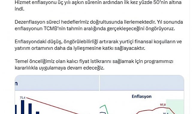 HAZİNE ve Maliye Bakanı Mehmet Şimşek, "Enflasyon 44 ayın en düşük seviyesinde. Yıl sonunda enflasyonun TCMB'nin tahmin aralığında gerçekleşeceğini öngörüyoruz" dedi.Bakan Şimşek, sosyal medya hesabından açıklama yaptı. Şimşek, "Enflasyon 44 ayın en düşük seviyesinde. Aylık enflasyon temmuzda geçici ve dönemsel etkilerle yüzde 2,06 gerçekleşirken yıllık enflasyon son 12 ayda 28,3 puan düşüşle yüzde 33,5'e geriledi. Yıllık gıda enflasyonu yüzde 28, temel mal enflasyonu yüzde 20,7 oldu. Hizmet enflasyonu 3 yılı aşkın sürenin ardından ilk kez yüzde 50'nin altına indi. Dezenflasyon süreci hedeflerimiz doğrultusunda ilerlemektedir. Yıl sonunda enflasyonun TCMB'nin tahmin aralığında gerçekleşeceğini öngörüyoruz. Enflasyondaki düşüş, öngörülebilirliği artırarak yurtiçi finansal koşulların ve yatırım ortamının daha da iyileşmesine katkı sağlayacaktır. Temel önceliğimiz olan kalıcı fiyat istikrarını sağlamak için programımızı kararlılıkla uygulamaya devam edeceğiz" ifadelerini kullandı.