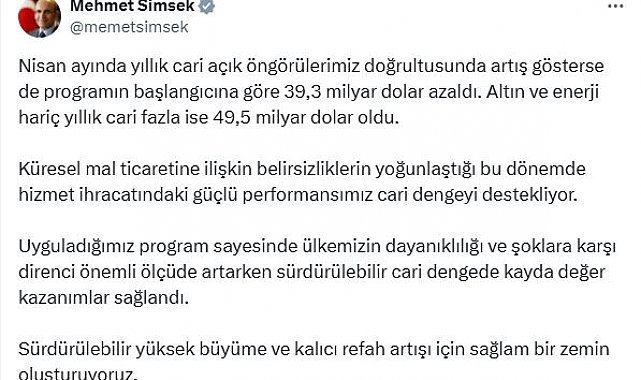HAZİNE ve Maliye Bakanı Mehmet Şimşek, "Küresel mal ticaretine ilişkin belirsizliklerin yoğunlaştığı bu dönemde hizmet ihracatındaki güçlü performansımız cari dengeyi destekliyor" dedi. Hazine ve Maliye Bakanı Mehmet Şimşek, ödemeler dengesi istatistiklerine ilişkin sosyal medya hesabından açıklama yaptı. Bakan Şimşek, "Nisan ayında yıllık cari açık öngörülerimiz doğrultusunda artış gösterse de programın başlangıcına göre 39,3 milyar dolar azaldı. Altın ve enerji hariç yıllık cari fazla ise 49,5 milyar dolar oldu. Küresel mal ticaretine ilişkin belirsizliklerin yoğunlaştığı bu dönemde hizmet ihracatındaki güçlü performansımız cari dengeyi destekliyor. Uyguladığımız program sayesinde ülkemizin dayanıklılığı ve şoklara karşı direnci önemli ölçüde artarken sürdürülebilir cari dengede kayda değer kazanımlar sağlandı. Sürdürülebilir yüksek büyüme ve kalıcı refah artışı için sağlam bir zemin oluşturuyoruz" dedi.