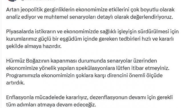 HAZİNE ve Maliye Bakanı Mehmet Şimşek, "Hürmüz Boğazı'nın kapanması durumunda senaryolar üzerinden ekonomimize yönelik yapılan spekülasyonlara lütfen itibar etmeyiniz. Programımızla ekonomimizin şoklara karşı direncini önemli ölçüde artırdık" dedi.Hazine ve Maliye Bakanı Mehmet Şimşek, soysal medya hesabından yaptığı açıklamada, "Artan jeopolitik gerginliklerin ekonomimize etkilerini çok boyutlu olarak analiz ediyor ve muhtemel senaryoları detaylı olarak değerlendiriyoruz. Piyasalarda istikrarın ve ekonomimizde sağlıklı işleyişin sürdürülmesi için kurumlarımız güçlü bir eş güdüm içinde gereken tedbirleri hızlı ve kararlı şekilde almaya hazırdır. Hürmüz Boğazı'nın kapanması durumunda senaryolar üzerinden ekonomimize yönelik yapılan spekülasyonlara lütfen itibar etmeyiniz. Programımızla ekonomimizin şoklara karşı direncini önemli ölçüde artırdık. Enflasyonla mücadelede kararlıyız, dezenflasyonun devamı için gerekli tüm adımları atmaya devam edeceğiz" ifadelerini kullandı.