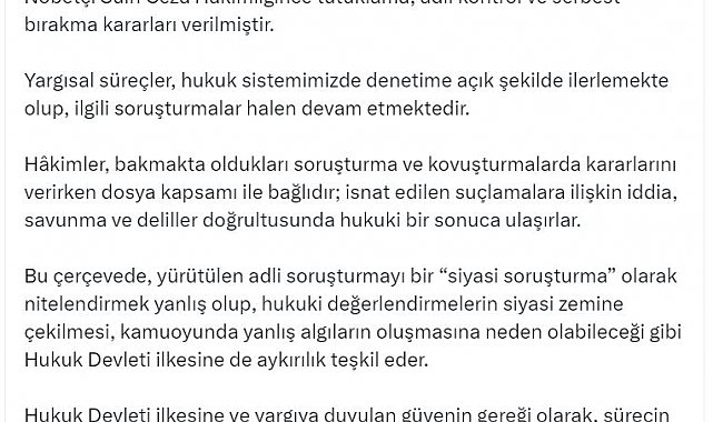 ADALET Bakanı Yılmaz Tunç, İstanbul Büyükşehir Belediye Başkanı Ekrem İmamoğlu hakkındaki soruşturmaya ilişkin, "Yürütülen adli soruşturmayı bir 'siyasi soruşturma' olarak nitelendirmek yanlış olup, hukuki değerlendirmelerin siyasi zemine çekilmesi, kamuoyunda yanlış algıların oluşmasına neden olabileceği gibi hukuk devleti ilkesine de aykırılık teşkil eder" dedi.Bakan Tunç, sosyal medya hesabından yaptığı açıklamada, "İstanbul Cumhuriyet Başsavcılığı tarafından yürütülen soruşturmalar kapsamında, İstanbul Büyükşehir Belediye Başkanının da aralarında bulunduğu bazı şüpheliler hakkında isnat edilen suçlar bakımından Nöbetçi Sulh Ceza Hakimliğince tutuklama, adli kontrol ve serbest bırakma kararları verilmiştir. Yargısal süreçler, hukuk sistemimizde denetime açık şekilde ilerlemekte olup, ilgili soruşturmalar halen devam etmektedir. Hakimler, bakmakta oldukları soruşturma ve kovuşturmalarda kararlarını verirken dosya kapsamı ile bağlıdır; isnat edilen suçlamalara ilişkin iddia, savunma ve deliller doğrultusunda hukuki bir sonuca ulaşırlar" dedi.'ADALET, TARAFSIZ YARGI MERCİLERİ ELİYLE TECELLİ EDER'Bu çerçevede, yürütülen adli soruşturmayı bir 'siyasi soruşturma' olarak nitelendirmenin yanlış olduğunu kaydeden Bakan Tunç, "Hukuki değerlendirmelerin siyasi zemine çekilmesi, kamuoyunda yanlış algıların oluşmasına neden olabileceği gibi hukuk devleti ilkesine de aykırılık teşkil eder. Hukuk devleti ilkesine ve yargıya duyulan güvenin gereği olarak, sürecin tüm yönleriyle tamamlanması beklenmeli, yorum ve değerlendirmeler bu çerçevede itidalli bir yaklaşımla ele alınmalıdır. Unutulmamalıdır ki adalet, yalnızca Türk milleti adına karar veren bağımsız ve tarafsız yargı mercileri eliyle tecelli eder. Bu nedenle, sorumluluk makamında olanlar başta olmak üzere herkesin açıklamalarında daha dikkatli, özenli ve sorumluluk bilinciyle hareket etmeleri, toplumda yanlış anlaşılmalara yol açabilecek beyanlardan kaçınmaları gerektiği unutulmamalıdır" ifadelerini kullandı.