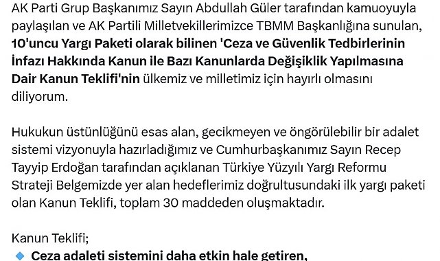 ADALET Bakanı Yılmaz Tunç, infaz düzenlemesinin TBMM'ye sunulmasına ilişkin, "Kanun teklifinin milletvekillerimizin takdiriyle uzlaşı içerisinde Gazi Meclisimizde kabul edileceğine yürekten inanıyorum. Amacımız; toplumu suçtan korumak, toplumsal barış ve huzura katkı sunmak, vatandaşlarımızın adalete en etkin şekilde erişimini sağlamak, hukuk sistemimizin güven veren yapısını daha da güçlendirmektir" dedi.Adalet Bakanı Yılmaz Tunç, sosyal medya hesabından yaptığı açıklamada, "AK Parti Grup Başkanımız Sayın Abdullah Güler tarafından kamuoyuyla paylaşılan ve AK Partili Milletvekillerimizce TBMM Başkanlığına sunulan, 10'uncu Yargı Paketi olarak bilinen 'Ceza ve Güvenlik Tedbirlerinin İnfazı Hakkında Kanun ile Bazı Kanunlarda Değişiklik Yapılmasına Dair Kanun Teklifi'nin ülkemiz ve milletimiz için hayırlı olmasını diliyorum" ifadelerini kullandı.'SUÇ VE SUÇLUYLA ETKİN MÜCADELE SAĞLAYACAK'Hukukun üstünlüğünü esas alan, gecikmeyen ve öngörülebilir bir adalet sistemi vizyonuyla hazırlanan ve Cumhurbaşkanımız Recep Tayyip Erdoğan tarafından açıklanan Türkiye Yüzyılı Yargı Reformu Strateji Belgesinde yer alan hedefler doğrultusundaki ilk yargı paketi olan kanun teklifinin toplam 30 maddeden oluştuğunu kaydeden Bakan Tunç, "Kanun teklifi; ceza adaleti sistemini daha etkin hale getiren, infaz sistemini daha da güçlendiren, cezasızlık algısını ortadan kaldıran, suç ve suçluyla etkin mücadele sağlayan, suç işlenmesini önleyen ve caydırıcılığı artıran, bazı suçların cezalarının artırılmasını öngören önemli düzenlemeleri içermektedir. Kanun teklifinin milletvekillerimizin takdiriyle uzlaşı içerisinde Gazi Meclisimizde kabul edileceğine yürekten inanıyorum. Amacımız; toplumu suçtan korumak, toplumsal barış ve huzura katkı sunmak, vatandaşlarımızın adalete en etkin şekilde erişimini sağlamak, hukuk sistemimizin güven veren yapısını daha da güçlendirmektir. Cumhurbaşkanımız Sayın Recep Tayyip Erdoğan'ın liderliğinde, bu amaç doğrultusunda Türkiye Yüzyılı'nı Adaletin Yüzyılı yapmak için çalışmalarımıza durmaksızın ve kararlılıkla devam edeceğiz" dedi.