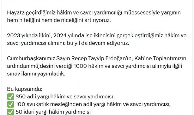 ADALET Bakanı Yılmaz Tunç, "Cumhurbaşkanımız Sayın Recep Tayyip Erdoğan'ın, Kabine toplantımızın ardından müjdesini verdiği bin hakim ve savcı yardımcısı alımıyla ilgili sınav ilanını yayımladık" dedi.Adalet Bakanı Yılmaz Tunç, hakim ve savcı yardımcısı alımlarına ilişkin sosyal medya hesabından açıklama yaptı. Bakan Tunç, "Yargı hizmetlerinin vatandaşlarımıza daha etkili ve verimli şekilde sunulması için tarafsız ve bağımsız yargının insan kaynağını güçlendirmeye devam ediyoruz. Hayata geçirdiğimiz hakim ve savcı yardımcılığı müessesesiyle yargının hem niteliğini hem de niceliğini artırıyoruz. 2023 yılında ilkini, 2024 yılında ise ikincisini gerçekleştirdiğimiz hakim ve savcı yardımcısı alımına bu yıl da devam ediyoruz. Cumhurbaşkanımız Sayın Recep Tayyip Erdoğan'ın, Kabine toplantımızın ardından müjdesini verdiği bin hakim ve savcı yardımcısı alımıyla ilgili sınav ilanını yayımladık. Bu kapsamda; 850 adli yargı hakim ve savcı yardımcısı, 100 avukatlık mesleğinden adli yargı hakim ve savcı yardımcısı, 50 idari yargı hakim yardımcısı alımını gerçekleştireceğiz" ifadelerine yer verdi.'KÜRSÜYE DAHA DONANIMLI ÇIKACAKLAR'Bakan Tunç, ÖSYM tarafından 20-21 Aralık'ta yapılacak sınava girecek tüm adaylara başarılar dilediğini belirterek, "Sınavı kazanarak mülakat aşamasını da başarıyla tamamlayan hakim ve savcı yardımcılarımız; 36 aylık eğitim sürecinin 1 yılını Türkiye Adalet Akademisinde, 2 yılını ise tecrübeli hakim ve savcılarımızın yanında usta-çırak ilişkisi içerisinde çalışarak geçirecekler. Kutsal bir mesleği icra edecek olan hakim ve savcı yardımcılarımız böylece kürsüye daha donanımlı ve güçlü bir şekilde çıkacaklar. Hukukun üstünlüğünü esas alan, gecikmeyen ve öngörülebilir bir adalet sistemi vizyonumuz doğrultusunda çalışmalarımıza kararlılıkla devam edecek, 'Türkiye Yüzyılı'nı, adaletin yüzyılı yapacağız" dedi.
