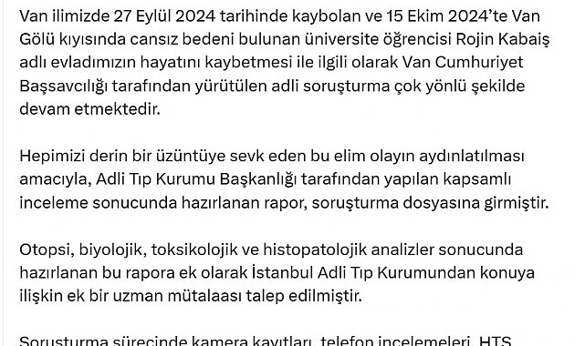 ADALET Bakanı Yılmaz Tunç, Rojin Kabaiş'in ölümüne ilişkin, Adli Tıp Kurumu Başkanlığı'nın otopsi, biyolojik, toksikolojik ve histopatolojik analizler sonucunda hazırladığı rapora ek olarak İstanbul Adli Tıp Kurumu'ndan ek bir uzman mütalaası talep edildiğini açıkladı.Adalet Bakanı Yılmaz Tunç, 27 Eylül 2024 tarihinde kaybolduktan sonra, 15 Ekim 2024'te Van Gölü kıyısında cansız bedeni bulunan Rojin Kabaiş'in ölümüne ilişkin soruşturmayla ilgili, sosyal medya hesabından açıklama yaptı. Bakan Tunç, "Van ilimizde 27 Eylül 2024 tarihinde kaybolan ve 15 Ekim 2024'te Van Gölü kıyısında cansız bedeni bulunan üniversite öğrencisi Rojin Kabaiş adlı evladımızın hayatını kaybetmesi ile ilgili olarak Van Cumhuriyet Başsavcılığı tarafından yürütülen adli soruşturma çok yönlü şekilde devam etmektedir. Hepimizi derin bir üzüntüye sevk eden bu elim olayın aydınlatılması amacıyla Adli Tıp Kurumu Başkanlığı tarafından yapılan kapsamlı inceleme sonucunda hazırlanan rapor, soruşturma dosyasına girmiştir. Otopsi, biyolojik, toksikolojik ve histopatolojik analizler sonucunda hazırlanan bu rapora ek olarak İstanbul Adli Tıp Kurumu'ndan konuya ilişkin ek bir uzman mütalaası talep edilmiştir. Soruşturma sürecinde kamera kayıtları, telefon incelemeleri, HTS dökümleri ve tanık ifadeleri de detaylı biçimde değerlendirilmiş, evladımızın kullandığı telefonun kilidinin açılması için yurt dışından uzmanların da dahil olduğu teknik çalışma ve bazı dijital materyallerin incelemeleri devam etmektedir. Soruşturma kapsamında, hiçbir ayrıntı göz ardı edilmeden bütün deliller ve raporlar derinlemesine incelenmekte, yargı makamlarının koordinasyonunda tüm süreç titizlikle yürütülmektedir. Başta Rojin evladımızın acılı ailesi olmak üzere milletimiz müsterih olsun; soruşturmada tek bir nokta dahi karanlıkta kalmadan maddi gerçeğin mutlaka ortaya çıkarılması için yoğun bir gayret gösterilmektedir. Rojin evladımıza bir kez daha Allah'tan rahmet, ailesine ve yakınlarına sabırlar diliyorum" ifadelerini kullandı.