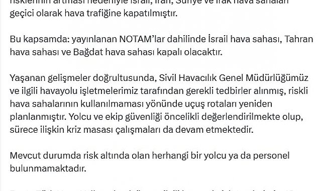 ULAŞTIRMA ve Altyapı Bakanı Abdulkadir Uraloğlu, "Başta Türk Hava Yolları olmak üzere, ilgili havayolu işletmelerimiz, 16 Haziran 2025 Pazartesi gününe kadar İran, Irak, Suriye ve Ürdün'e yönelik seferlerini iptal etmiştir" dedi.Bakan Uraloğlu, sosyal medya hesabından yaptığı açıklamada, "13 Haziran 2025 tarihinde sabah erken saatlerde İsrail tarafından İran'a yönelik başlatılan hava saldırıları neticesinde, bölgedeki güvenlik risklerinin artması nedeniyle İsrail, İran, Suriye ve Irak hava sahaları geçici olarak hava trafiğine kapatılmıştır. Bu kapsamda yayınlanan NOTAM'lar dahilinde İsrail hava sahası, Tahran hava sahası ve Bağdat hava sahası kapalı olacaktır. Yaşanan gelişmeler doğrultusunda, Sivil Havacılık Genel Müdürlüğümüz ve ilgili havayolu işletmelerimiz tarafından gerekli tedbirler alınmış, riskli hava sahalarının kullanılmaması yönünde uçuş rotaları yeniden planlanmıştır. Yolcu ve ekip güvenliği öncelikli değerlendirilmekte olup, sürece ilişkin kriz masası çalışmaları da devam etmektedir. Mevcut durumda risk altında olan herhangi bir yolcu ya da personel bulunmamaktadır. Başta Türk Hava Yolları olmak üzere, ilgili havayolu işletmelerimiz, 16 Haziran 2025 Pazartesi gününe kadar İran, Irak, Suriye ve Ürdün'e yönelik seferlerini iptal etmiştir" dedi.