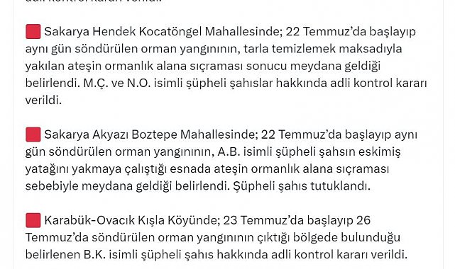 İÇİŞLERİ Bakanı Ali Yerlikaya, 22-27 Temmuz tarihleri arasında çıkan orman yangınlarıyla ilgili 7 şüphelinin gözaltına alındığını ve bunlardan 3'ünün tutuklandığını, 4 kişi hakkında ise adli kontrol kararı verildiğini duyurdu.Bakan Yerlikaya, sosyal medya hesabından yaptığı açıklamada, "Sakarya Hendek Kocatöngel Mahallesi'nde; 22 Temmuz'da başlayıp aynı gün söndürülen orman yangınının, tarla temizlemek maksadıyla yakılan ateşin ormanlık alana sıçraması sonucu meydana geldiği belirlendi. M.Ç. ve N.O. isimli şüpheli şahıslar hakkında adli kontrol kararı verildi. Sakarya Akyazı Boztepe Mahallesinde; 22 Temmuz'da başlayıp aynı gün söndürülen orman yangınının, A.B. isimli şüpheli şahsın eskimiş yatağını yakmaya çalıştığı esnada ateşin ormanlık alana sıçraması sebebiyle meydana geldiği belirlendi. Şüpheli şahıs tutuklandı. Karabük-Ovacık Kışla Köyünde; 23 Temmuz'da başlayıp 26 Temmuz'da söndürülen orman yangınının çıktığı bölgede bulunduğu belirlenen B.K. isimli şüpheli şahıs hakkında adli kontrol kararı verildi. Balıkesir-Savaştepe Karaçam Mahallesinde; 25 Temmuz'da başlayıp aynı gün söndürülen orman yangınının bir işletmede temizlik maksadıyla yakılan ateşin ormanlık alana sıçraması nedeniyle meydana geldiği belirlendi. Bu kapsamda yangın çıkan bölgede bulunduğu tespit edilen N.A., H.S. ve M.S. isimli şüpheli şahıslar gözaltına alındı. 2'si tutuklandı, 1'i hakkında adli kontrol kararı verildi" dedi.Bakan Yerlikaya, "22-27 Temmuz 2025 tarihleri arasında meydana gelen orman yangınlarıyla ilgili jandarmamız tarafından; 7 şüpheli şahıs gözaltına alındı. Bunların 3'ü tutuklandı; 4'ü hakkında adli kontrol kararı verildi. Özellikle sıcak yaz günlerinde ormanlarımızı korumak adına vatandaşlarımızın çok daha temkinli ve tedbirli olmaları büyük önem taşıyor. Allah her türlü afetten ülkemizi ve milletimizi korusun" ifadelerini kullandı.