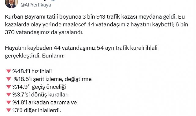 İÇİŞLERİ Bakanı Ali Yerlikaya, Kurban Bayramı tatili boyunca meydana gelen 3 bin 913 trafik kazasında 44 kişinin hayatını kaybettiğini, 6 bin 370 kişinin de yaralandığını açıkladı.Bakan Yerlikaya, sosyal medya hesabından yaptığı açıklamada, "Kurban Bayramı tatili boyunca 3 bin 913 trafik kazası meydana geldi. Bu kazalarda olay yerinde maalesef 44 vatandaşımız hayatını kaybetti; 6 bin 370 vatandaşımız da yaralandı. Hayatını kaybeden 44 vatandaşımız 54 ayrı trafik kuralı ihlali gerçekleştirdi. Bunların yüzde 48.1'i hız ihlali, yüzde 18.5'i şerit izleme, değiştirme, yüzde 14.9'i geçiş önceliği, yüzde 3.7'si dönüş kuralları, yüzde 1.8'i arkadan çarpma ve yüzde 13'ü diğer ihlallerdi. Kurban Bayramı tatilinde trafik kazalarındaki can kayıplarının 18'i yerleşim yeri içinde; 26'sı yerleşim yeri dışında meydana geldi. Kurban Bayramı tatilinde, 30-35 km aralıklarla radar uygulaması yapılan otoyollarda ölümlü trafik kazaları çok daha az yaşandı. Hız sınırı 140 olan otoyollarımızda can kaybı şükürler olsun 'sıfır.' Hız sınırının 130 olduğu otoyollarda ise maalesef 2 vatandaşımız hayatını kaybetti. Radar uygulamasının daha seyrek olduğu; hız sınırının 50 ila 80 km arasında değiştiği yerlerde maalesef 22 vatandaşımızı, hız sınırının 90 ila 110 km arasında değiştiği yerlerde ise maalesef 20 vatandaşımızı kaybettik. Ve maalesef hayatını kaybeden 44 vatandaşımızdan 14'ü, motosiklet sürücüsü ve motosiklette yolcu konumunda olanlardan oluşuyor. İzmir'de meydana gelen ve 5 vatandaşımızın hayatını kaybettiği kazada, sürücünün ehliyetine, 'alkollü araç kullanmaktan' 3 kez işlem yapıldığı; bu nedenle kazanın olduğu tarihte ise sürücü belgesinin geçici olarak geri alınmış olduğu tespit edildi" dedi.'SEYİR HIZINI DÜŞÜREN HIZ UYARI LEVHALARI TEKRAR GÖZDEN GEÇİRİLECEK'Yerlikaya, Kurban Bayramı tatilinde meydana gelen ölümlü trafik kazalarının her birini tek tek incelediklerini ve ayrıntıları kamuoyuyla paylaşacaklarını belirterek, "İçişleri Bakanlığı olarak 30 Mayıs-11 Haziran tarihleri arasında, 13 gün boyunca, 'Yolun sonu bayram olsun' diyerek trafik güvenliğini en üst seviyeye taşıdık. Amacımız çok netti; 'Tek bir canımızı dahi, trafik kazasında kaybetmeyelim!' Bu hedef doğrultusunda; 68 bin 829 polis ve jandarma personelimiz, ülkemizin dört bir yanında, trafik denetimlerini yapmak üzere, görev başındaydılar. Bu süre zarfında 1.485 mobil radar ile gece-gündüz hız kontrollerimizi gerçekleştirdik. Dron ve helikopterlerle, 6 bin 339 saat havadan denetim yaptık. Şehirler arası yolcu taşıyan otobüsleri 3 bin gizli yolcumuz ile denetledik. 5 günlük Kurban Bayramı tatili boyunca bir günde ortalama 500 bin 704 aracın yüz yüze denetimi gerçekleşti. 2 bin 688'i otoyollarda, 12 bin 465'i de diğer yollarda olmak üzere günde ortalama 15 bin 153 araca hız nedeniyle cezai işlem uygulandı. Ulaştırma ve Altyapı Bakanlığımız ile İçişleri Bakanlığı olarak, karayollarımızdaki uyarı levhalarıyla ilgili bir inceleme komisyonu kurduk. Seyir hızını düşüren hız uyarı levhaları tekrar gözden geçirilecek" ifadelerini kullandı.'AMACIMIZ CEZAİ İŞLEM UYGULAMAK DEĞİL, BİR CANIMIZI DAHİ TRAFİK KAZALARINDA KAYBETMEMEKTİR'Hayatını kaybedenlere Allah'tan rahmet, yaralılara acil şifalar dileyen Yerlikaya, "Trafik denetimlerimizde, yol kontrollerimizde, radar uygulamalarımızda amacımız; her zaman söylediğimiz gibi, cezai işlem uygulamak değil, bir canımızı dahi trafik kazalarında kaybetmemektir. Çünkü trafikte kaybettiğimiz her bir can, bir evladın yetim kalması; bir annenin bağrının yanmasıdır. Trafik kurallarına uyan tüm vatandaşlarımıza teşekkür ediyorum. Bayram demeden, gece gündüz demeden denetimleri aksatmayan; sabırla, güler yüzle, fedakarca çalışan emniyet ve jandarma teşkilatlarımızı, sahada süreci bizzat yöneten valilerimizi ve kaymakamlarımızı tebrik ediyorum" dedi.
