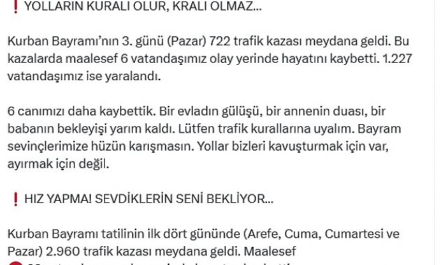 İÇİŞLERİ Bakanı Ali Yerlikaya, Kurban Bayramı'nın ilk 4 gününde meydana gelen 2 bin 960 trafik kazasında 32 kişinin hayatını kaybettiğini, 4 bin 817 kişinin yaralandığını açıkladı.Bakan Yerlikaya, sosyal medya hesabından yaptığı açıklamada, "Kurban Bayramı tatilinin ilk dört gününde (arefe, cuma, cumartesi ve pazar) 2 bin 960 trafik kazası meydana geldi. Maalesef 32 vatandaşımız olay yerinde hayatını kaybetti. 4 bin 817 vatandaşımız ise yaralandı. Yolların kuralı olur, kralı olmaz. Bir evladın gülüşü, bir annenin duası, bir babanın bekleyişi yarım kaldı. Lütfen trafik kurallarına uyalım. Bayram sevinçlerimize hüzün karışmasın. Yollar bizleri kavuşturmak için var, ayırmak için değil. Hız yapma! Sevdiklerin seni bekliyor. Bir anlık hız, bir ömürlük pişmanlık. Yaşama tutun" dedi.'1 MİLYON 912 BİN ARAÇ DENETLENDİ'Hayatını kaybedenlere Allah'tan rahmet, yaralılara acil şifalar dileyen Yerlikaya, "Kurban Bayramı'nda emniyet ve jandarma trafik ekiplerimiz vatandaşlarımızın güvenliği için gerekli önlemleri alıyor, denetimleri büyük bir hassasiyetle sürdürüyor. Bayram Tatilinin ilk 4 gününde trafik ekiplerimizce; 1 milyon 912 bin 720 araç denetlendi. Denetlemelerimiz işlem yapmak için değil, kazaları önlemek ve can kaybımızı sıfıra indirmek içindir. Trafik kurallarına uyalım, bayram sevincimize hüzün karışmasın" açıklamasında vulundu.