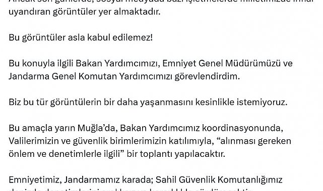 İÇİŞLERİ Bakanı Ali Yerlikaya, turizm bölgelerindeki bazı işletmelerde çekilen ve sosyal medyada tepki toplayan görüntülerle ilgili, "Bu konuyla ilgili Bakan Yardımcımızı, Emniyet Genel Müdürümüzü ve Jandarma Genel Komutan Yardımcımızı görevlendirdim. Biz bu tür görüntülerin bir daha yaşanmasını kesinlikle istemiyoruz" dedi.Bakan Ali Yerlikaya, sosyal medya hesabından yaptığı açıklamada, 2024 yılında, 62 milyonu aşkın turist ağırladıklarını ve turizm sektörünün Türkiye'nin parlayan yıldızı olduğunu belirterek, "Ancak son günlerde; sosyal medyada bazı işletmelerde milletimizde infial uyandıran görüntüler yer almaktadır. Bu görüntüler asla kabul edilemez. Bu konuyla ilgili Bakan Yardımcımızı, Emniyet Genel Müdürümüzü ve Jandarma Genel Komutan Yardımcımızı görevlendirdim. Biz bu tür görüntülerin bir daha yaşanmasını kesinlikle istemiyoruz. Bu amaçla yarın Muğla'da, Bakan Yardımcımız koordinasyonunda, valilerimizin ve güvenlik birimlerimizin katılımıyla, 'alınması gereken önlem ve denetimlerle ilgili' bir toplantı yapılacaktır. Emniyetimiz, jandarmamız karada; Sahil Güvenlik Komutanlığımız denizde denetimlerini aralıksız ve kararlılıkla sürdürecektir. Yapılan denetim ve sonuçları şeffaf bir biçimde kamuoyuna duyurulacaktır" ifadelerini kullandı.