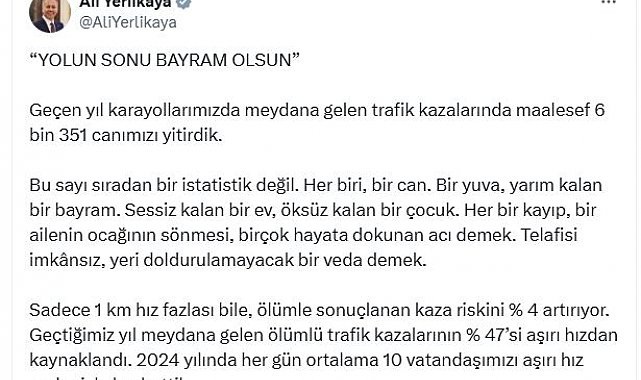 İÇİŞLERİ Bakanı Ali Yerlikaya, "Sadece 1 kilometre hız fazlası bile, ölümle sonuçlanan kaza riskini yüzde 4 artırıyor. Geçtiğimiz yıl meydana gelen ölümlü trafik kazalarının yüzde 47'si aşırı hızdan kaynaklandı. 2024 yılında her gün ortalama 10 vatandaşımızı aşırı hız nedeniyle kaybettik" dedi.İçişleri Bakanı Ali Yerlikaya, sosyal medya hesabından yaptığı paylaşımda, "Yolun sonu bayram olsun. Geçen yıl kara yollarımızda meydana gelen trafik kazalarında maalesef 6 bin 351 canımızı yitirdik. Bu sayı sıradan bir istatistik değil. Her biri, bir can. Bir yuva, yarım kalan bir bayram. Sessiz kalan bir ev, öksüz kalan bir çocuk. Her bir kayıp, bir ailenin ocağının sönmesi, birçok hayata dokunan acı demek. Telafisi imkansız, yeri doldurulamayacak bir veda demek. Sadece 1 kilometre hız fazlası bile, ölümle sonuçlanan kaza riskini yüzde 4 artırıyor. Geçtiğimiz yıl meydana gelen ölümlü trafik kazalarının yüzde 47'si aşırı hızdan kaynaklandı. 2024 yılında her gün ortalama 10 vatandaşımızı aşırı hız nedeniyle kaybettik. Kurban Bayramı'nda yola çıkacak olan sevgili vatandaşlarımız; lütfen trafik kurallarına harfiyen uyalım. Bayramlar bizi sevdiklerimize kavuşturmak içindir, ayırmak için değil. Bazen trafikte göstereceğimiz bir saniyelik sabır, bir ömür mutluluk getirir. Ve bayram sabahları sevdiklerimizin boynu bükük kalmaz. Asla aşırı hız yapmayalım. Emniyet kemerimizi mutlaka takalım. Yorgun ve uykusuzken; direksiyon başına geçmeyelim. Trafikte gözümüz cep telefonunda değil, yolda olsun" ifadelerini kullandı. Bakan Yerlikaya'nın paylaşımında, aşırı hız konusu ile ilgili bir kamu spotu da yer aldı.
