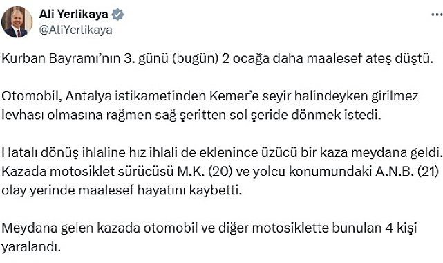 İÇİŞLERİ Bakanı Ali Yerlikaya, Antalya'da hatalı dönüş ve hız ihlali nedeniyle meydana gelen kazada, motosiklet sürücüsü M.K. (20) ve yolcu konumundaki A.N.B.'nin (21) olay yerinde hayatını kaybettiğini duyurdu. Bakan Yerlikaya, sosyal medya hesabından kaza görüntüsünü paylaşarak, "Kurban Bayramı'nın 3'üncü günü (bugün) 2 ocağa daha maalesef ateş düştü. Otomobil, Antalya istikametinden Kemer'e seyir halindeyken girilmez levhası olmasına rağmen sağ şeritten sol şeride dönmek istedi. Hatalı dönüş ihlaline hız ihlali de eklenince üzücü bir kaza meydana geldi. Kazada motosiklet sürücüsü M.K. (20) ve yolcu konumundaki A.N.B. (21) olay yerinde maalesef hayatını kaybetti. Meydana gelen kazada otomobil ve diğer motosiklette bunulan 4 kişi yaralandı. Hayatını kaybeden vatandaşlarımıza Allah'tan rahmet, yaralılarımıza acil şifalar diliyorum. Her zaman ifade ettiğimiz gibi; Yollar bizleri sevdiklerimize kavuşturmak için vardır, ayırmak için değil. Lütfen ama lütfen trafik kurallarına uyalım. Hatalı şerit değiştirmekten ve aşırı hızdan kaçınalım. Motosiklet sürücülerine karşı daha dikkatli olalım. Kavşak ve dönüşlerde karşıdan gelen motosikletler fark edilmeyebilir. Dönüş yapmadan önce motosikletlerin hızlarını ve mesafelerini dikkatle değerlendirelim. Ani manevralardan kaçınalım" dedi.