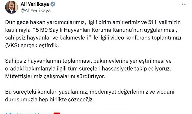 İÇİŞLERİ Bakanı Ali Yerlikaya, "Sahipsiz hayvanların toplanması, bakımevlerine yerleştirilmesi ve oradaki bakımlarıyla ilgili tüm süreçleri hassasiyetle takip ediyoruz" dedi.Bakan Yerlikaya, sosyal medya hesabından yaptığı açıklamada, dün gece bakan yardımcıları, ilgili birim amirleri ve 51 ilin valisinin katılımıyla '5199 Sayılı Hayvanları Koruma Kanunu'nun uygulanması, sahipsiz hayvanlar ve bakımevleri' ile ilgili video konferans toplantısı gerçekleştirdiklerini bildirdi. Yerlikaya, "Sahipsiz hayvanların toplanması, bakımevlerine yerleştirilmesi ve oradaki bakımlarıyla ilgili tüm süreçleri hassasiyetle takip ediyoruz. Müfettişlerimiz çalışmalarını sürdürüyor. Bu süreçteki konuları yasalarımız, medeniyet değerlerimiz ve vicdani duruşumuzla hep birlikte çözeceğiz" ifadelerini kullandı.