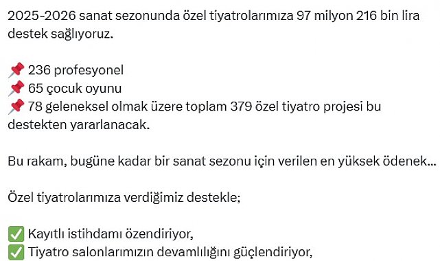 KÜLTÜR ve Turizm Bakanlığı tarafından özel tiyatroların projelerine yapılacak destek miktarı, bir önceki sezona göre yüzde 49,56 oranında artırılarak 97 milyon 216 bin liraya yükseltildi. Bakanlıktan yapılan açıklamaya göre; özel tiyatroların projelerine yapılacak yardımlar belli oldu. Bu kapsamda 2025-2026 sanat sezonu için ayrılan destek miktarı, bir önceki sezona göre yüzde 49,56 oranında artırılarak 97 milyon 216 bin liraya yükseltildi. Bu tutar, bakanlık tarafından özel tiyatrolara bugüne kadar sağlanan en yüksek destek miktarı oldu. 2025-2026 sanat sezonunda özel tiyatro projelerine sağlanacak yardımlar için başvuru süreci tamamlandı. Toplam 434 özel tiyatronun başvuruda bulunduğu süreçte, eksik belgelerini süresi içerisinde tamamlamayan 34 özel tiyatro dışındaki 400 başvuru değerlendirmeye alındı.BAŞVURULARIN YÜZDE 94,75'İ OLUMLU SONUÇLANDIDeğerlendirme Komisyonu tarafından yapılan incelemeler sonucunda, 236 profesyonel tiyatro, 65 çocuk oyunu ve 78 geleneksel tiyatro olmak üzere toplam 379 özel tiyatro projesine destek verilmesi kararlaştırıldı. Böylece başvuruların yüzde 94,75'i olumlu sonuçlanarak destek kapsamına alındı. Bakanlıkça özel tiyatrolara sağlanan bu desteklerle, tiyatro sektöründe kayıtlı istihdamın özendirilmesi, özel tiyatro salonlarının sanat hayatına katkısının artması ve sürekliliğinin sağlanması hedefleniyor. Ayrıca tiyatro sanatının, kalkınmada öncelikli bölgeler başta olmak üzere yurt sathına yayılması, daha fazla Türk oyun yazarına ait eserin tercih edilmesi ve böylece Türk tiyatrosunun gelişmesine katkı sunulması amaçlanıyor. 2025-2026 sanat sezonu kapsamında destek almaya hak kazanan özel tiyatro projelerine ilişkin bilgilere, Kültür ve Turizm Bakanlığı Güzel Sanatlar Genel Müdürlüğünün www.guzelsanatlar.gov.tr adresinden ulaşılabiliyor. 'TİYATROYU YURT SATHINA YAYIYORUZ'Güzel Sanatlar Genel Müdürlüğü'nün sosyal medya hesabından yapılan paylaşımda da "2025-2026 sanat sezonunda özel tiyatrolarımıza 97 milyon 216 bin lira destek sağlıyoruz. 236 profesyonel, 65 çocuk oyunu, 78 geleneksel olmak üzere toplam 379 özel tiyatro projesi bu destekten yararlanacak. Bu rakam, bugüne kadar bir sanat sezonu için verilen en yüksek ödenek. Özel tiyatrolarımıza verdiğimiz destekle; kayıtlı istihdamı özendiriyor, tiyatro salonlarımızın devamlılığını güçlendiriyor, Türk oyun yazarlarının eserlerini teşvik ediyor, tiyatroyu yurt sathına yayıyoruz" denildi.