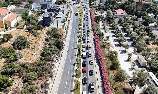 AYDIN'ın Kuşadası ilçesine 24 saatte 60 binden fazla araç giriş yaptı. Tatilci akınına uğrayan ilçedeki kilometrelerce araç kuyruğu, dronla görüntülendi.Türkiye'nin önemli turizm merkezlerinden Kuşadası'na, Kurban Bayramı'nda tatilcilerin ilgisi yoğun oldu. Başta İzmir olmak üzere Manisa ve Denizli gibi yakın illerden tatil yapmak için araçlarıyla Kuşadası'na gelenler, kentin Selçuk girişinde uzun kuyruklar oluşturdu. İlçeye dün saat 12.00'den sonra 24 saatte 60 binden fazla araç giriş yaparken, otellerdeki doluluk oranı ise yüzde 100'e ulaştı. Tatilci akınına uğrayan ilçede, yerli ve yabancı turistler trafikte araçlarıyla ilerlemekte güçlük çekti. Araç yoğunluğu ise dronla görüntülendi.Kurban Bayramı boyunca günü birlik ziyaretçilerle birlikte Kuşadası'nda nüfusun 1,5 milyona çıkması bekleniyor.