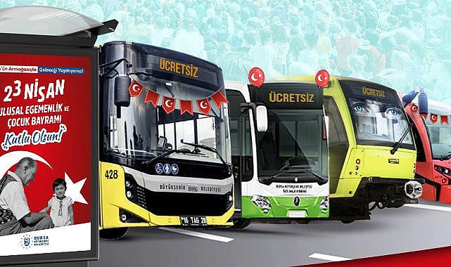 Bursa Büyükşehir Belediyesi’nin ulaşım iştiraki BURULAŞ, 23 Nisan Ulusal Egemenlik ve Çocuk Bayramı dolayısıyla şehir içi toplu ulaşımın gün boyunca ücretsiz olacağını duyurdu.BURULAŞ’ın sosyal medya hesabından yapılan açıklamaya göre, 23 Nisan saat 00.00 ile 23.59 arasında kent genelinde toplu ulaşım hizmetleri ücretsiz olarak kullanılabilecek.Uygulama kapsamında BursaRay, tramvay hatları ve otobüsler vatandaşlara ücretsiz hizmet verecek.Ücretsiz ulaşım uygulamasından yararlanmak isteyen yolcuların, araçlara biniş sırasında BursaKart kullanmaları yeterli olacak.Açıklamada; uygulamanın kent içinde ayakta yolcu taşıyan hatlarda geçerli olacağını belirtildi.