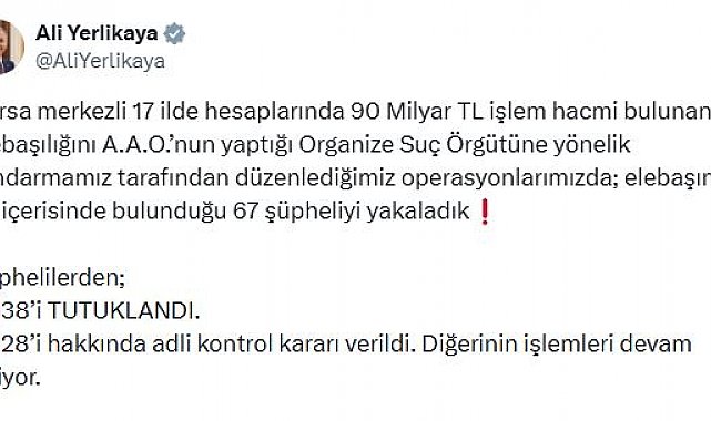 İÇİŞLERİ Bakanı Ali Yerlikaya, dolandırıcı organize suç örgütüne yönelik Bursa merkezli 17 ilde düzenlenen operasyonda 67 şüphelinin yakalandığını, şüphelilerden ️38'inin tutuklandığını açıkladı.İçişleri Bakanı Ali Yerlikaya, dolandırıcı suç örgütüne yönelik jandarma tarafından düzenlenen operasyonu sosyal medya hesabından paylaştı. Buna göre; elebaşılığını A.A.O.'nun yaptığı organize suç örgütüne yönelik Bursa merkezli 17 ilde düzenlenen operasyonda, elebaşı dahil 67 şüpheli yakalandı. MASAK raporlarına istinaden şüphelilerin hesaplarında yaklaşık 90 milyar TL işlem hacmi bulunduğu tespit edildi. Operasyon sonucu 15 soğuk cüzdan, 4 ruhsatsız tabanca, 52 lüks kol saati, 42 milyon TL değerinde altın ve ziynet eşyası ile çok sayıda kaşe, değerli belge, doküman ve dijital materyal ele geçirildi. Ayrıca şüpheli ve şirketlere ait 2 bin 125 banka hesabı, 105 kripto varlık hesabı, 68 taşınmaz mal varlığı ve 32 araca el konuldu. Şüphelilerden 38'i tutuklandı, 28'i hakkında adli kontrol kararı verildi. Diğerinin işlemleri devam ediyor.Şüphelilerin haklarında; 'Suç işlemek amacıyla örgüt kurmak', 'Bilişim sistemlerinin araç olarak kullanılması suretiyle nitelikli dolandırıcılık' ve 'Suçtan kaynaklanan malvarlığı değerlerini aklama' suçlarından soruşturma başlatıldı.