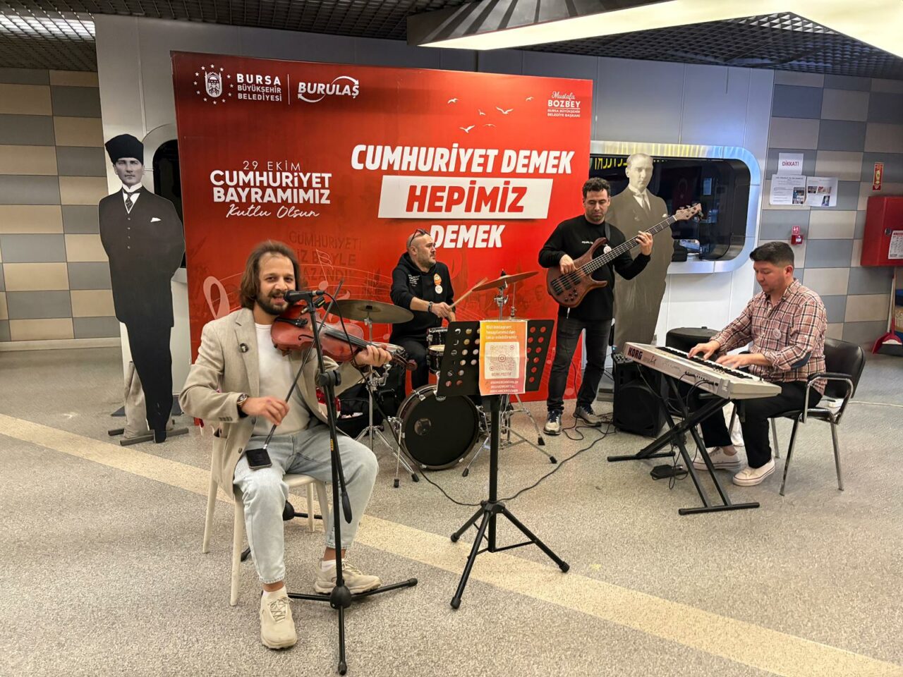 Bursa Büyükşehir Belediyesi’nin Cumhuriyet Bayramı’na özel hazırladığı etkinlikte, Şehreküstü metrosunda canlı müzik konseri düzenlendi. Vatandaşlar, metroya binmek üzere peronlarda beklerken Cumhuriyet marşlarıyla karşılandı.Şarkılara eşlik eden yolcular, istasyonun her köşesini bayraklarla süsleyerek Cumhuriyet coşkusuna ortak oldu. Özellikle çocukların ve gençlerin yoğun ilgi gösterdiği etkinlikte, marşlar hep bir ağızdan söylendi.