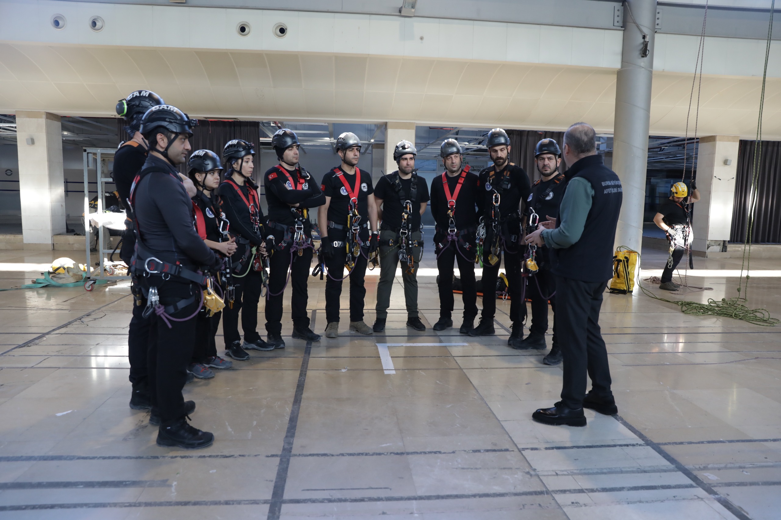 Bursa Büyükşehir Belediyesi, afetlere dirençli kent vizyonu doğrultusunda, BAM başta olmak üzere tüm ilgili birimlerin eğitim ve hazırlık faaliyetlerini aralıksız sürdürmeye devam ediyor. Merinos Yerleşkesi Fuaye Alanı’nda ‘İple Kurtarma Sistemleri ve Arama-Kurtarma eğitimi’ alan ekipler, uzman eğitmenler eşliğinde tavana asılı halatlara güvenlik ekipmanlarını kullanarak tırmandı. Yüksekten erişim, dar alanlara giriş, dikey kurtarma ve zorlu koşullarda güvenli müdahale kabiliyetlerinin geliştirilmesinin amaçlandığı eğitimde, teorik ve pratik bilgiler verildi. Eğitimde, personelin kişisel güvenliği, ekipman kullanımı, düğüm teknikleri, ip sistemleri ve koordineli kurtarma senaryoları uygulandı.