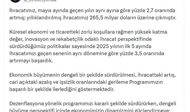 CUMHURBAŞKANI Yardımcısı Cevdet Yılmaz, "Küresel ekonomi ve ticaretteki zorlu koşullara rağmen yüksek katma değer, inovasyon ve rekabetçilik odaklı ihracat perspektifinde sürdürdüğümüz politikalar sayesinde 2025 yılının ilk 5 ayında ihracatımızı geçen senenin aynı dönemine göre yüzde 3,5 oranında artırmayı başardık" dedi.Cevdet Yılmaz, Ticaret Bakanı Ömer Bolat tarafından açıklanan 2025 yılı Mayıs ayına ait dış ticaret rakamlarını değerlendirdi. Yılmaz, sosyal medya hesabından yaptığı açıklamada, "İhracatımız, mayıs ayında geçen yılın aynı ayına göre yüzde 2,7 oranında artmış; yıllıklandırılmış ihracatımız 265,5 milyar doların üzerine çıkmıştır. Küresel ekonomi ve ticaretteki zorlu koşullara rağmen yüksek katma değer, inovasyon ve rekabetçilik odaklı ihracat perspektifinde sürdürdüğümüz politikalar sayesinde 2025 yılının ilk 5 ayında ihracatımızı geçen senenin aynı dönemine göre yüzde 3,5 oranında artırmayı başardık. Ekonomik büyümenin dengeli bir şekilde sürdürülmesi, ihracattaki artış, cari açıktaki azalış ve işsizlik oranlarındaki gerileme programımızın başarılı bir şekilde ilerlediğini göstermektedir. Dezenflasyona yönelik programımızı kararlı şekilde sürdürürken, dengeli büyüme perspektifi içinde ekonomimizin dinamizmini güçlendirmeye; yatırımı, istihdamı, üretimi ve ihracatı desteklemeye devam edeceğiz" ifadelerini kullandı.