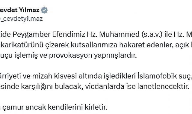 CUMHURBAŞKANI Yardımcısı Cevdet Yılmaz, Hazreti Muhammed ve Hazreti Musa'nın karikatürleri çizilerek provokasyon yapıldığını belirterek, "İfade hürriyeti ve mizah kisvesi altında işledikleri İslamofobik suç, hukuk çerçevesinde karşılığını bulacak, vicdanlarda ise lanetlenecektir" dedi. Cumhurbaşkanı Yardımcısı Yılmaz, sosyal medya hesabından yaptığı açıklamada, "Bir dergide Peygamber Efendimiz Hz. Muhammed (s.a.v.) ile Hz. Musa (a.s.)'ın karikatürünü çizerek kutsallarımıza hakaret edenler, açık bir nefret suçu işlemiş ve provokasyon yapmışlardır. İfade hürriyeti ve mizah kisvesi altında işledikleri İslamofobik suç, hukuk çerçevesinde karşılığını bulacak, vicdanlarda ise lanetlenecektir. Attıkları çamur ancak kendilerini kirletir" ifadelerini kullandı.
