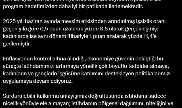 CUMHURBAŞKANI Yardımcısı Cevdet Yılmaz, "Son 26 aydır tek haneli seviyelerde istikrarlı seyreden işsizlik oranı program hedefimizden daha iyi bir patikada ilerlemektedir" dedi. Cumhurbaşkanı Yardımcısı Cevdet Yılmaz, Türkiye İstatistik Kurumu'nun (TÜİK) açıkladığı haziran ayı iş gücü istatistiklerine ilişkin değerlendirmede bulundu. Yılmaz, sosyal medya hesabından yaptığı açıklamada, "İşsizlik oranı bir önceki aya göre 0,2 puan yükselerek yüzde 8,6 olmuştur. Son 26 aydır tek haneli seviyelerde istikrarlı seyreden işsizlik oranı program hedefimizden daha iyi bir patikada ilerlemektedir. 2025 yılı Haziran ayında mevsim etkisinden arındırılmış işsizlik oranı geçen yıla göre 0,5 puan azalarak yüzde 8,6 olarak gerçekleşmiş; kadınlarda ise aynı dönem itibarıyla 1 puan azalarak yüzde 11,4'e gerilemiştir" dedi.'TOPLUMSAL REFAHI İLERİYE TAŞIMAYI AMAÇLIYORUZ'Yılmaz, "Enflasyonun kontrol altına alındığı, ekonomiye güvenin pekiştiği bu süreçte istihdamımızı artırmaya yönelik çok boyutlu tedbirler almaya, kadınların ve gençlerin iş gücüne katılımını destekleyen politikalarımızı uygulamaya devam ediyoruz. Sürdürülebilir kalkınma anlayışımız doğrultusunda istihdamı sadece nicelik yönüyle ele almayan; istihdamın bölgesel dağılımını, niteliğini ve verimliliğini gözeten bir yaklaşımla iş gücü piyasasındaki dönüşümü şekillendiriyoruz. Uyguladığımız politikalar ile sosyal refahı güçlendirmeyi, fırsat eşitliğini artırmayı ve toplumsal refahı ileriye taşımayı amaçlıyoruz" ifadelerini kullandı.