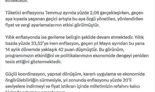 CUMHURBAŞKANI Yardımcısı Cevdet Yılmaz, Orta Vadeli Program (OVP) çerçevesinde enflasyonun düşmeye devam ettiğini açıkladı.Cumhurbaşkanı Yardımcısı Yılmaz, Türkiye İstatistik Kurumu (TÜİK) tarafından açıklanan Temmuz 2025 dönemine ilişkin tüketici fiyat endeksi verilerini değerlendirdi. Yılmaz, sosyal medya üzerinden yaptığı açıklamada, "Orta Vadeli Programımız çerçevesinde, enflasyonla mücadeleye yönelik kararlı ve koordineli adımlarımız sayesinde enflasyon düşmeye devam etmektedir. Tüketici enflasyonu, temmuz ayında yüzde 2,06 gerçekleşirken, geçen aya kıyasla yaşanan geçici artışta bu aya özgü yönetilen, yönlendirilen fiyat ve vergi ayarlamalarının etkisi görülmüştür" dedi.Yıllık enflasyonda ise gerilemenin belirgin şekilde devam ettiğini belirten Yılmaz, "Yıllık bazda yüzde 33,52'ye inen enflasyon, geçen yıl mayıs ayından bu yana 14 aylık dönemde yaklaşık 42 puan düşmüştür. Bu görünüm, programımızın etkinliğini ve politikalarımızın ekonomide dengeyi yeniden tesis ettiğini göstermektedir. Güçlü koordinasyon, yapısal dönüşüm, kararlı uygulama ve ekonomide öngörülebilirliğin sürmesiyle, yıl sonunda enflasyonu yüzde 20'li seviyelere indirmeyi ve fiyat istikrarı içinde milletimizin refahını kalıcı biçimde artırmayı amaçlıyoruz. İstikrar içinde dengeli büyümeye, istihdamımızı artırmaya, katma değeri ve verimliliği yükselten yatırımlar ile ihracatımızı artırmaya devam edeceğiz" ifadelerini kullandı.