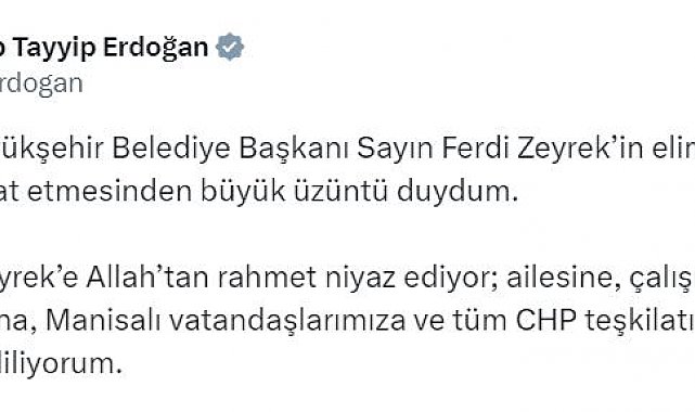 CUMHURBAŞKANI Recep Tayyip Erdoğan, oturduğu sitenin havuzundaki arızayla ilgilenirken elektrik akımına kapılan ve tedavi gördüğü hastanede hayatını kaybeden Manisa Büyükşehir Belediye Başkanı Ferdi Zeyrek için taziye mesajı yayımladı.Cumhurbaşkanı Erdoğan, sosyal medya hesabından yayımladığı mesajda, "Manisa Büyükşehir Belediye Başkanı Sayın Ferdi Zeyrek'in elim bir kaza sonucu vefat etmesinden büyük üzüntü duydum. Merhum Zeyrek'e Allah'tan rahmet niyaz ediyor; ailesine, çalışma arkadaşlarına, Manisalı vatandaşlarımıza ve tüm CHP teşkilatına başsağlığı diliyorum" dedi.