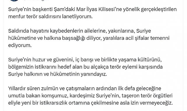 CUMHURBAŞKANI Recep Tayyip Erdoğan, Suriye'deki kiliseye yönelik terör saldırısıyla ilgili, "Suriye'nin huzur ve güvenini, iç barışı ve birlikte yaşama kültürünü, bölgemizin istikrarını hedef alan bu alçakça terör eylemi karşısında Suriye halkının ve hükümetinin yanındayız. Suriye hükümetinin terörle mücadelesine destek vermeyi sürdüreceğiz" dedi.Cumhurbaşkanı Erdoğan, sosyal medya hesabından yaptığı açıklamada, "Suriye'nin başkenti Şam'daki Mar İlyas Kilisesi'ne yönelik gerçekleştirilen menfur terör saldırısını lanetliyorum. Saldırıda hayatını kaybedenlerin ailelerine, yakınlarına, Suriye hükümetine ve halkına başsağlığı diliyor, yaralılara acil şifalar temenni ediyorum. Suriye'nin huzur ve güvenini, iç barışı ve birlikte yaşama kültürünü, bölgemizin istikrarını hedef alan bu alçakça terör eylemi karşısında Suriye halkının ve hükümetinin yanındayız. Yıllardır süren zulmün ve çatışmaların ardından ilk defa geleceğine umutla bakan komşumuz, kardeşimiz Suriye'nin, taşeron terör örgütleri eliyle yeni bir istikrarsızlık ortamına çekilmesine asla izin vermeyeceğiz. Suriye hükümetinin terörle mücadelesine destek vermeyi sürdüreceğiz" dedi.