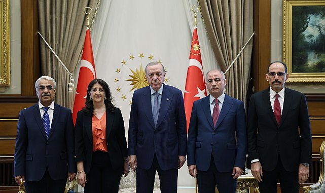 CUMHURBAŞKANI Recep Tayyip Erdoğan, DEM Parti İmralı heyetini kabul etti. Cumhurbaşkanı Erdoğan, DEM Parti TBMM Başkan Vekili ve Van Milletvekili Pervin Buldan ile Şanlıurfa Milletvekili Mithat Sancar'ı Cumhurbaşkanlığı Külliyesi'nde kabul etti. Kabulde, AK Parti Genel Başkan Vekili Efkan Ala ile Milli İstihbarat Teşkilatı (MİT) Başkanı İbrahim Kalın da yer aldı. Kabulde, 'Terörsüz Türkiye' hedefine ulaşmak için yürütülen çalışmalar ele alınacak.