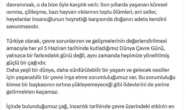 CUMHURBAŞKANI Recep Tayyip Erdoğan, "Daha yeşil bir dünya, daha sürdürülebilir bir yaşam ve gelecek nesiller için yaşanabilir bir çevre inşa etme sorumluluğumuz var. Bu sorumluluğu kimse bir başkasının sırtına yükleyemeyeceği gibi ödevlerini de yerine getirmekten kaçamaz" dedi.İletişim Başkanlığı, Cumhurbaşkanı Recep Tayyip Erdoğan'ın, 5 Haziran Dünya Çevre Günü mesajını yayımladı. Cumhurbaşkanı Erdoğan mesajında, "Doğanın dili sessizdir ama onun mesajı güçlü ve açıktır; biz ona nasıl davranırsak, o da bize öyle karşılık verir. Son yıllarda yaşanan küresel ısınma, çölleşme, bazı hayvan ırklarının toplu ölümleri, ani seller, heyelanlar insanoğlunun hoyratlığı karşısında doğanın adeta kendini savunmasıdır. Türkiye olarak, çevre sorunlarının ve gelişmelerinin değerlendirilmesi amacıyla her yıl 5 Haziran tarihinde kutladığımız Dünya Çevre Günü, yalnızca bir farkındalık günü değil, aynı zamanda hepimize yöneltilmiş güçlü bir çağrıdır. Daha yeşil bir dünya, daha sürdürülebilir bir yaşam ve gelecek nesiller için yaşanabilir bir çevre inşa etme sorumluluğumuz var. Bu sorumluluğu kimse bir başkasının sırtına yükleyemeyeceği gibi ödevlerini de yerine getirmekten kaçamaz. İçinde bulunduğumuz çağ, insanlık tarihinde çevre üzerindeki etkinin en yüksek seviyeye ulaştığı bir dönemdir. Doğal kaynaklarımız hızla tükenmekte, iklim değişikliği etkilerini derinleştirmekte, biyolojik çeşitlilik kayıpları geri dönüşü zor bir noktaya ulaşmaktadır. Bu gerçeklerle yüzleşmek ve harekete geçmek, sadece çevreyle ilgili kurumların değil, her bireyin, her kurumun ve tüm insanlığın ortak sorumluluğudur" ifadelerini kullandı.'EMANETİN GEREĞİNİ YERİNE GETİRMEK EN TEMEL GÖREVLERİMİZDEN'Çevrenin korunması ve sürdürülebilir kalkınmanın sağlanması yönünde çalışmalarını kararlılıkla sürdürdüklerini belirten Erdoğan, "Doğayı koruyan projeleri destekliyor, yeşil enerji, geri dönüşüm, Sıfır Atık ve doğa dostu kentleşme politikalarını hayata geçirme yönünde kapsamlı adımlar atıyoruz. Toprağımızı, suyumuzu, havamızı ve ormanlarımızı gelecek kuşaklara miras değil, emanet olarak görüyoruz. Bu emanetin gereğini yerine getirmek en temel görevlerimizden biridir. Bu özel günde, çocuklarımıza daha temiz bir doğa bırakmak adına, doğayla uyumlu bir yaşam kültürü oluşturmanın gayesi içerisindeyiz. 'Türkiye Yüzyılı'nda dünyanın en yaşanabilir doğası, doğal kaynakların verimli kullanıldığı bir ülke olma hedefimize ulaşacağımıza inanıyorum. Dünya Çevre Günü dolayısıyla vatandaşlarımıza ve tüm insanlığa bir kez daha seslenerek; herkesi enerji verimliliği, atık yönetimi, doğa koruma ve çevreye duyarlı tüketim alışkanlıkları konusunda hassas olmaya davet ediyorum. 5 Haziran Dünya Çevre Günü'nü kutluyor, doğaya saygılı, sürdürülebilir ve bilinçli bir yaşamın toplumun tüm kesimlerinde yaygınlaşmasını diliyorum. Tüm vatandaşlarımızı en kalbi duygularımla selamlıyorum" açıklamasında bulundu.